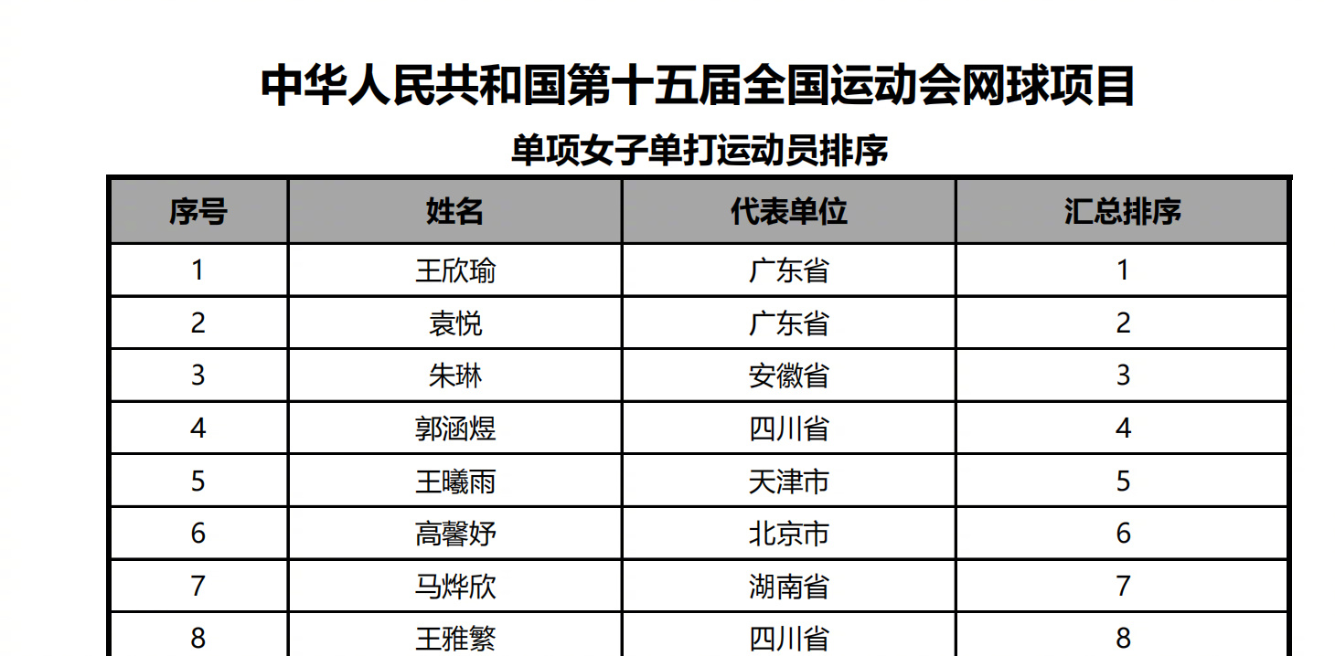 2025全运会网球女单公布前三种子:王欣瑜、袁悦、朱琳,这也意味着郑钦文退出了本