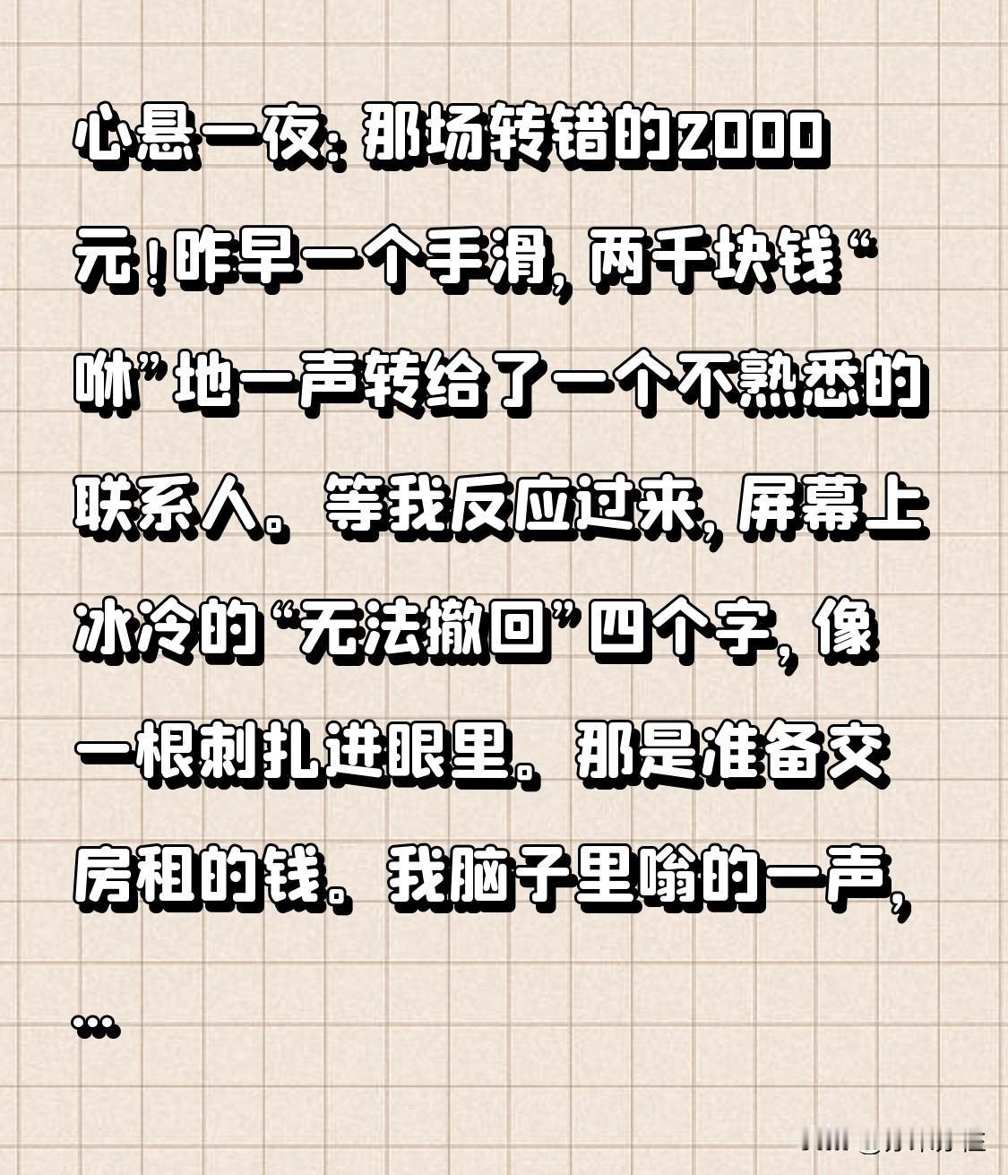 心悬一夜:那场转错的2000元! 昨早一个手滑,两千块钱“咻”地一声转给了一个不熟悉的联系人。等我反应过来,屏幕上冰冷的“无法撤回”四个字,像一根刺扎进眼里。 那是准备交房租的钱。我脑子里嗡的一声,整个人像被抽空了力气。发信息解释,对方迟迟不回;想打电话,又怕语气太急反而坏事。一整天坐立不安,心里像有蚂蚁在爬。 就在几乎绝望时,一个念头突然闪过——如果他用消息刷屏,让转账提醒被淹没呢? 我像抓住了救命稻草,开始疯狂地给他发图片。从天空云朵拍到路边野花,从午餐饭菜发到窗外夜景,一张接一张,不停不休。手机相册几乎被掏空,指尖在屏幕上机械地重复着发送动作。我甚至不知道自己在发什么,只盼着那堆红点能筑成一道墙,把那条要命的转账通知埋进最深的地方。 直到今天早上,手机突然弹出提醒——“对方未接收,款项已退回”。那一刻,我长长地舒出一口气,整个人瘫在椅子上,仿佛刚刚跑完一场马拉松。 那笔失而复得的钱静静躺在余额里,像在无声地提醒我:慌乱中的急智,有时真能照亮绝境中的路。 真心的为自己点赞!!