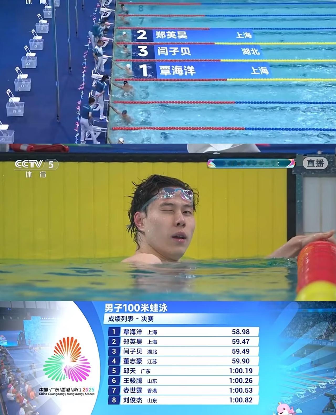 蛙王覃海洋58.98首夺全运会100蛙冠军。 同时打破了赛会纪录,郑英昊、闫子贝、董志豪四人游进1分。祝贺蛙王打破赛会记录夺冠,虽然成绩比新加坡世锦赛夺冠成绩差些,但依然国内断层无对手。