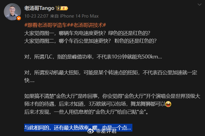 最近有时候真会觉得,物理学是不是不存在了。发动机热效率这个参数,和一台车的油耗高低息息相关。为了把发动机的热效率从30%提升到40% ,全球的汽车工程师花了50年。此前的工程师们燃尽了所有手段,也就只能让量产汽油发动机的热效率做到45%。但是近一两年,新车们特别是国产混动新车的发动机热效率,开始坐火箭似的上飙。现在没有个46%甚至是48%都不好意思出来宣传了。。。现在的热效率数字已经变得和前一阵的风阻系数很像了,很多路数不正的车企为了数字好看,在测试中掺杂了不少猫腻。不仅让原先的核心技术指标变成了营销上的数字游戏,还让真正下功夫钻研热效率的厂家变得吃力不讨好。就跟咱们读书的时候考试似的,十次考试差评君有一回发挥超常拿了90分,剩下九次都60多分,我就逮着一次超常发挥的成绩大吹特吹。同理,车企宣传的所谓最高热效率,这只能说明发动机在某个时间达到了某个热效率,并不能反映发动机的真实水平。若数值不真实,则攀比无意义。人们不是一定要买一台啥啥都是第一的车型。1%的热效、eq率提升也远没有做好品控来的重要。我也真心希望,某天能有车企在发布会上大大方方的说出自己的综合热效率,并告诉大伙最高热效率的局限性。