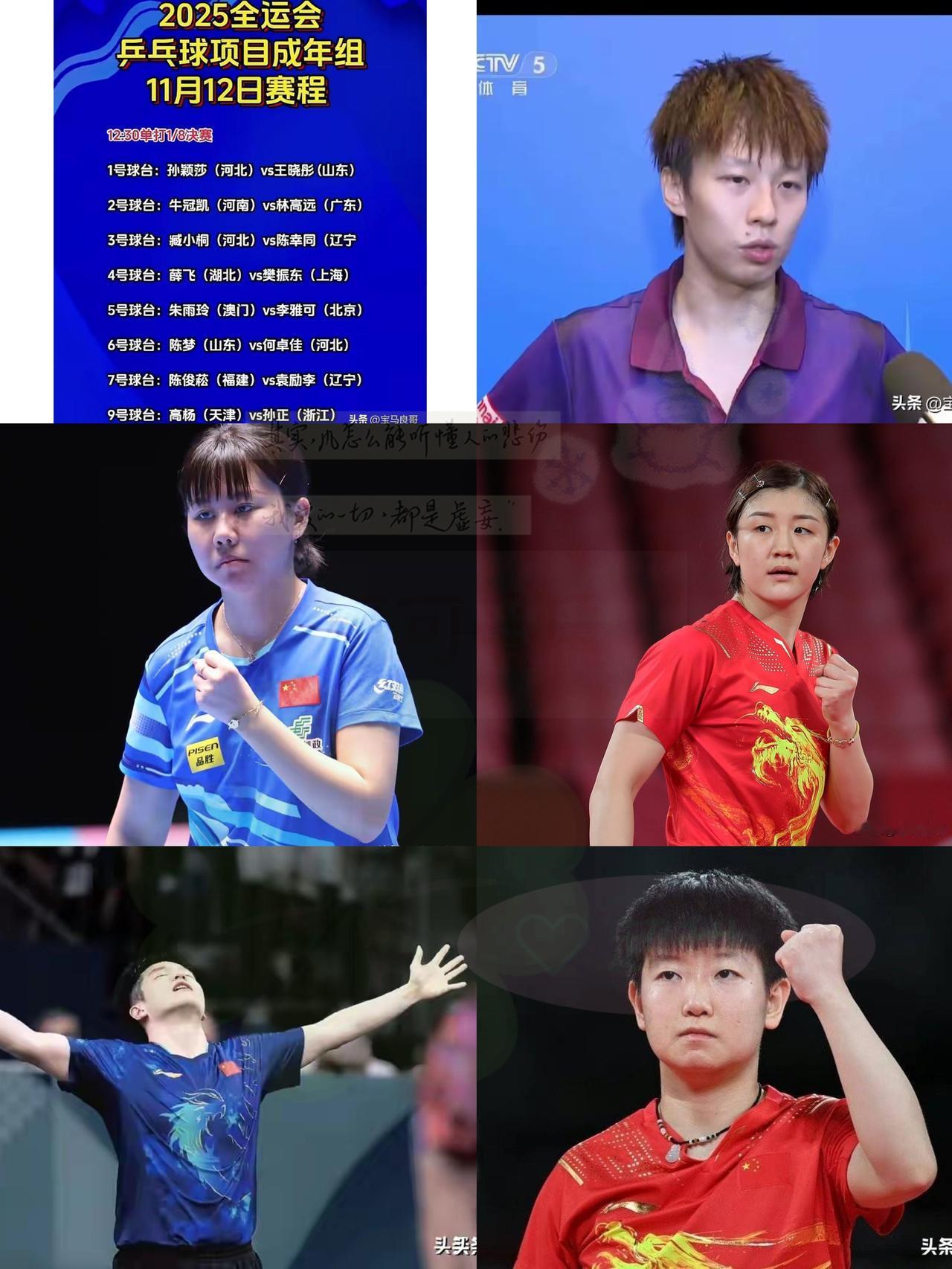 友友们! 全运会乒乓神仙打架局来啦! 中午12:30锁定央视体育,孙颖莎迎战王晓彤超有看头~ 莎莎4-0横扫晋级状态拉满,王晓彤也实力不俗,这场内战绝对火花四溅,个人觉得莎莎稳赢但过程肯定超精彩! 樊振东对薛飞、陈梦碰何卓佳也同步开打,横板vs直板、新老对决双重看点,真没法预判输赢~ 还有陈幸同、林高远等高手齐出战,乒乓盛宴错过血亏! 你更看好谁拿下本轮胜利?快来评论区聊聊,一起蹲比赛为喜欢的选手加油呀!