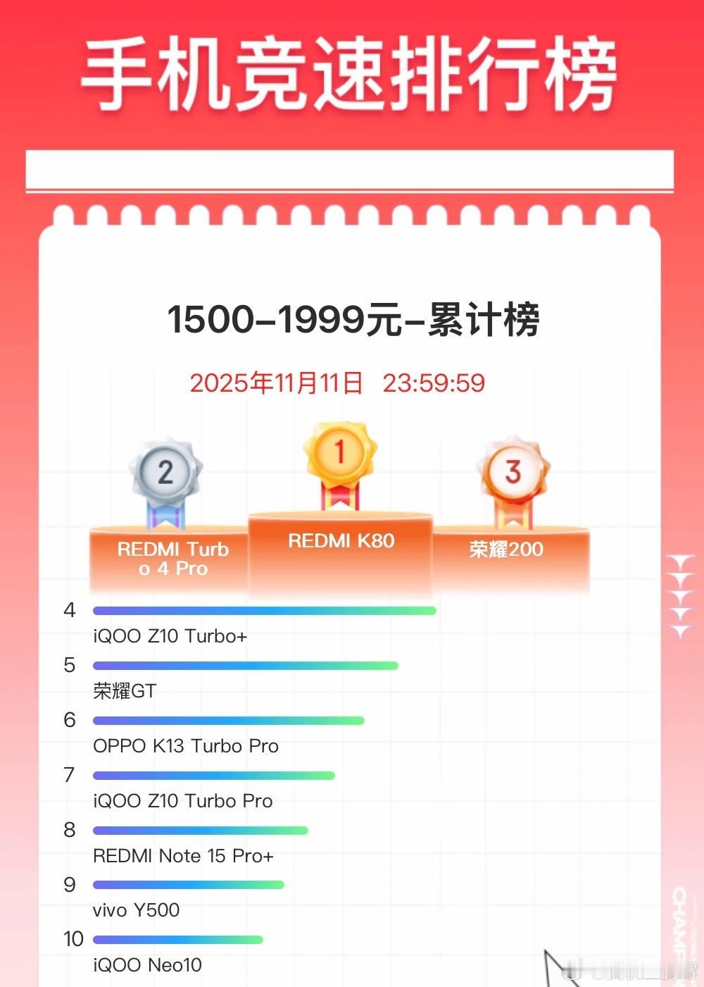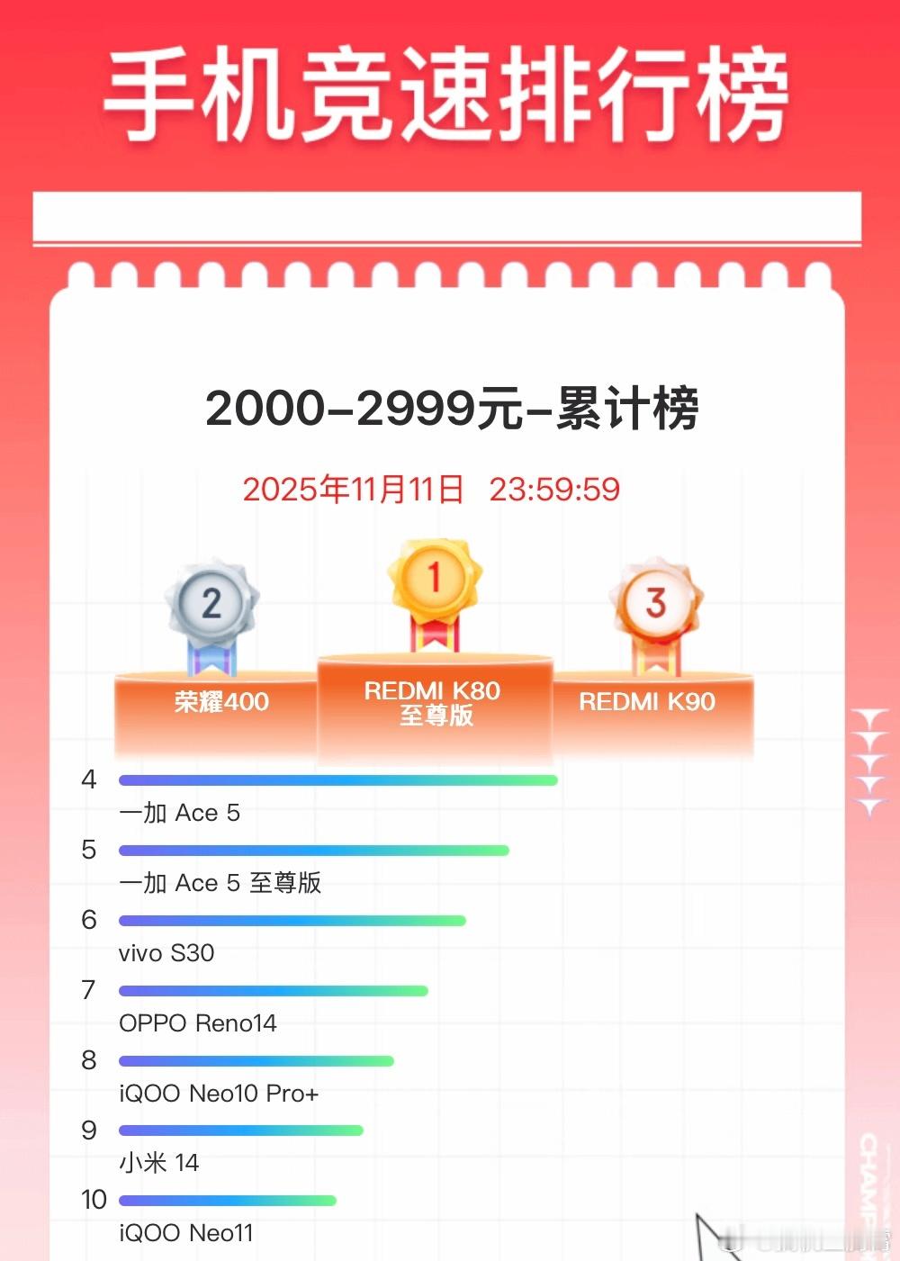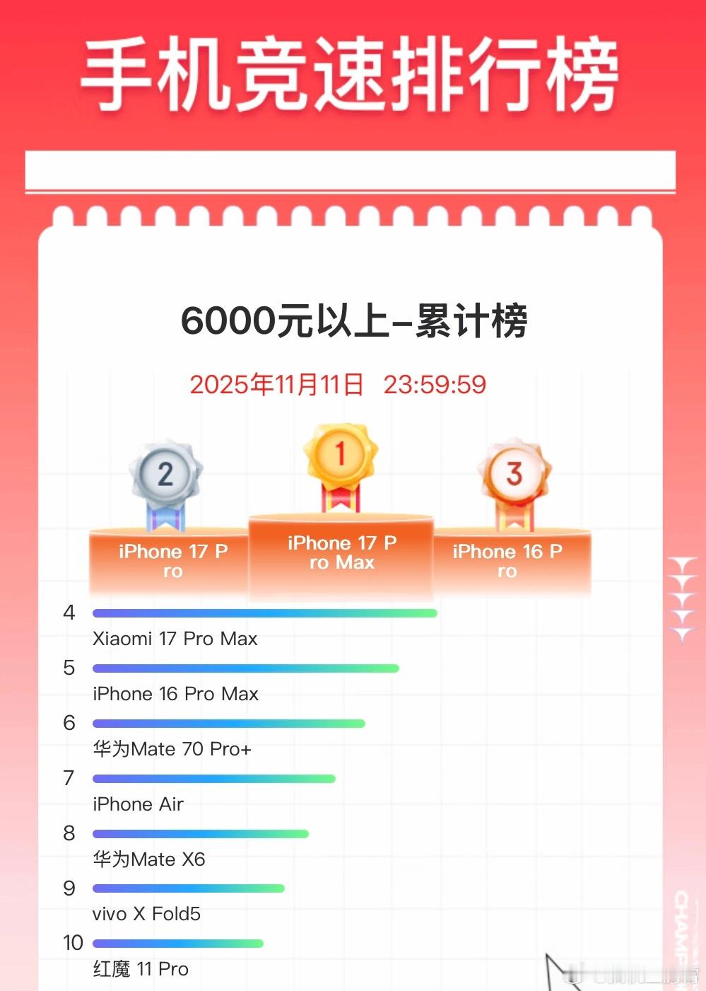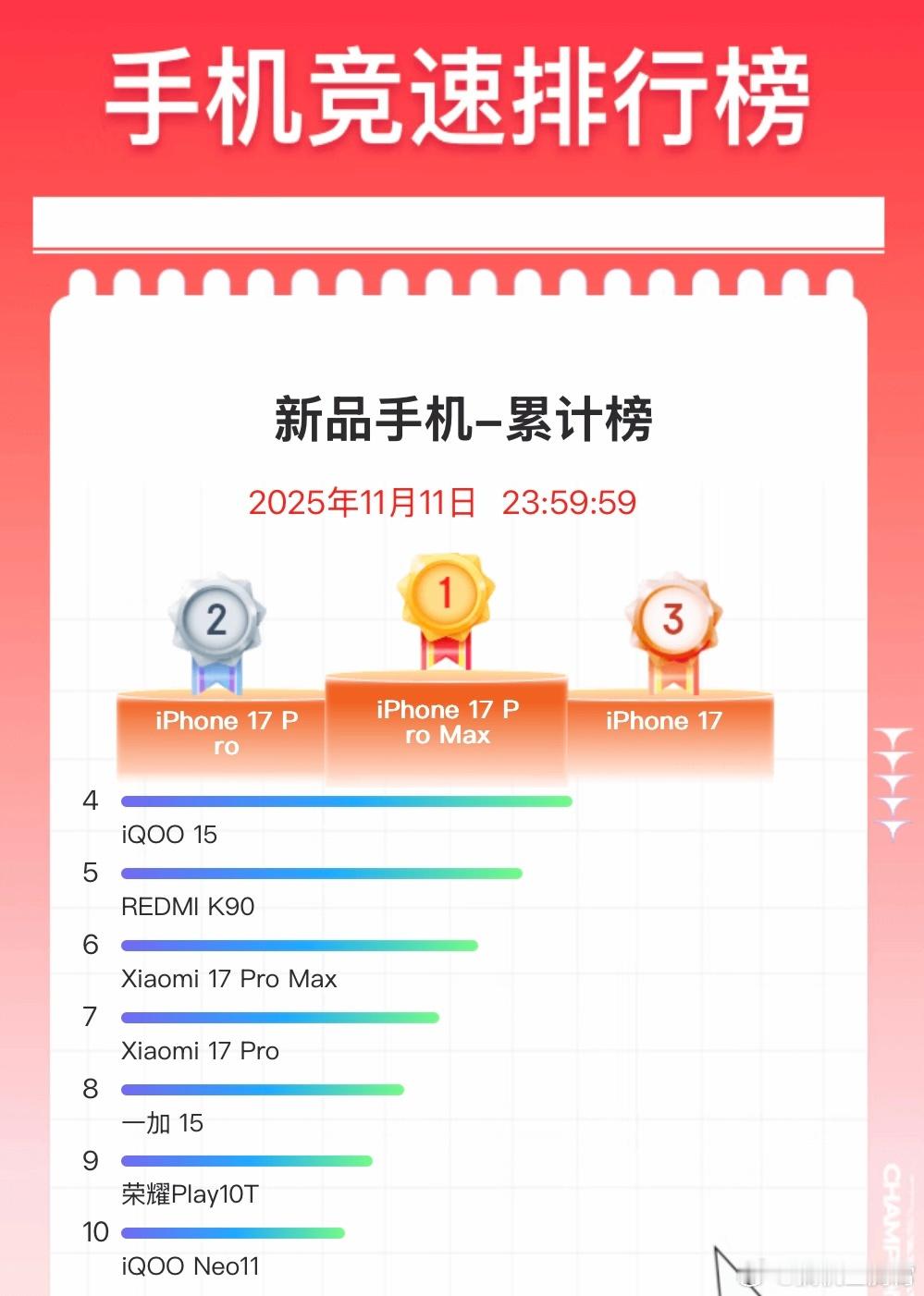 给你们盘了下各价位段卖的最好的机型【全部单品累计榜】:①.iPhone17 Pro Max、②.iPhone17 Pro、③.iPhone17【6K+价位段】:①.iPhone17 Pro Max、②.iPhone17 Pro、③.iPhone16 Pro【4~6K价位段】:①.iPhone17、②.iQOO 15、③.小米17 Pro【3~4K价位段】:①.iPhone15、②.iPhone15、③.REDMI K80 Pro【2~3K价位段】:①.REDMI K80至尊版、②.荣耀400、③.REDMI K90【1.5~2K价位段】:①.REDMI K80、②.REDMI Turbo4 Pro、③.荣耀200【1~1.5K价位段】:①.荣耀X70、②.REDMI Note 15 Pro、③.REDMI Note 13 Pro【0.5~1K价位段】:①.荣耀Play10C、②.REDMI Note 14、③.REDMI Note 13【近期新机累计榜】:①.iPhone17 Pro Max、②.iPhone17 Pro、③.iPhone17高端市场依旧还是果子的地盘,整个iPhone17系列除了Air,都卖爆了,当然除果子外那就是华子,不过万万没想到红魔11 Pro似乎卖的也还不错。另外就是近期这波新机里面,小米17系列和iQOO 15都很突出,卖的还都挺不错,你们看了榜单啥感觉