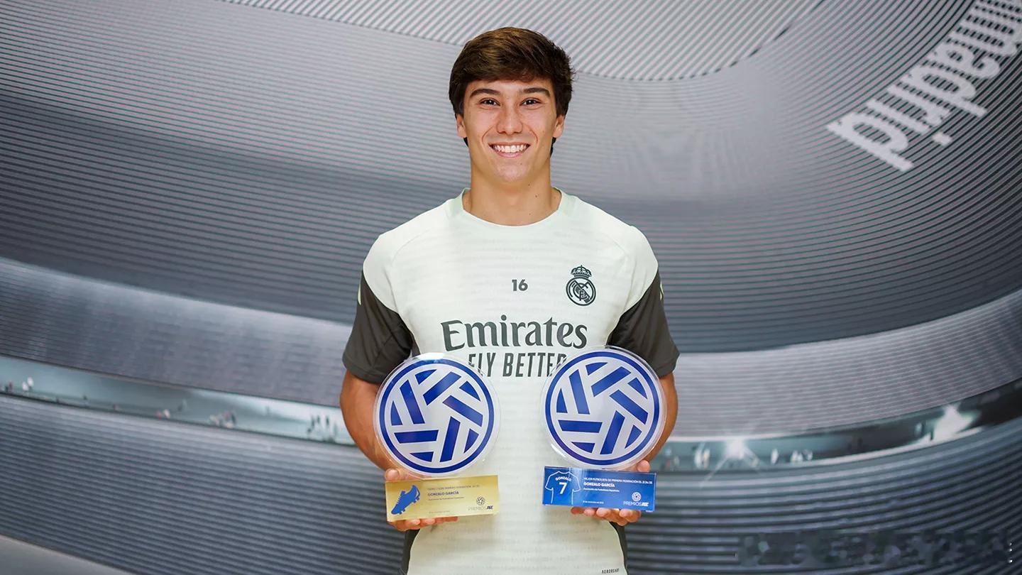 贡萨洛荣膺西协甲金靴奖及第二组最佳球员在马德里拉斯文塔斯斗牛场举行的第四届西班牙足球运动员协会(AFE)颁奖典礼上,皇家马德里前锋贡萨洛·加西亚成为焦点人物。这位青训球员因在卡斯蒂亚队的出色表现获得认可,同时摘得西班牙足协甲级联赛第二组最佳球员奖项和基尼·恩里克·卡斯特罗最佳射手奖。这位青训射手上赛季斩获25粒进球,成为西班牙足协甲级联赛创立以来单赛季进球最多的球员。同时,他也追平了马里亚诺在本世纪的卡斯蒂亚队常规赛进球纪录,并列成为队史最佳射手。