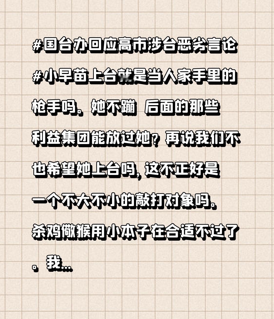 小早苗上台就是当人家手里的枪手吗。她不蹦跶后面的那些利益集团能放过她? 再说我们不也希望她上台吗,这不正好是一个不大不小的敲打对象吗。杀鸡儆猴用小本子在合适不过了。我们的国仇家恨这回应该能先收点利息了吧。