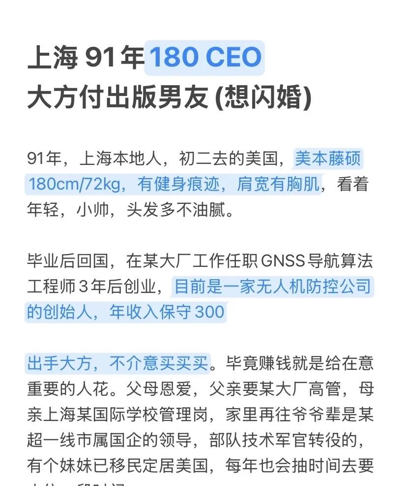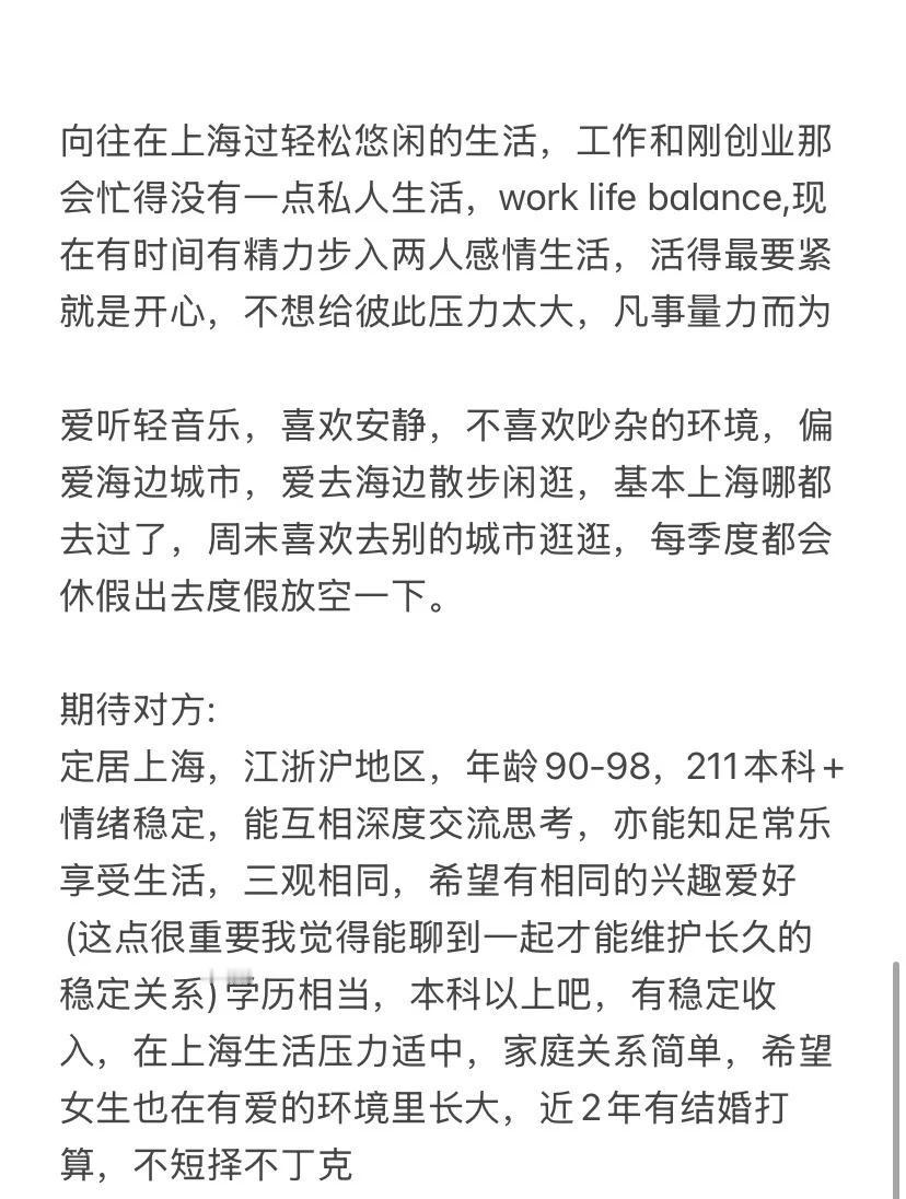 上海,91年小帅CEO,大方付出,真诚想结婚 期待对方: 定居上海,江浙沪地区,年龄90-98,211本科+ 情绪稳定,能互相深度交流思考,亦能知足常乐享受生活,三观相同,希望有相同的兴趣爱好(这点很重要我觉得能聊到一起才能维护长久的稳定关系)学历相当,本科以上吧,有稳定收入,在上海生活压力适中,家庭关系简单,希望女生也在有爱的环境里长大,近2年有结婚打算,不短择不丁克 💗非本人征婚发帖,已得嘉宾授权,想认识的这里可以牵线介绍哦 上海 相亲 大龄单身 奔着结婚找对象 等一个对的人出现 以结婚为目的的恋爱