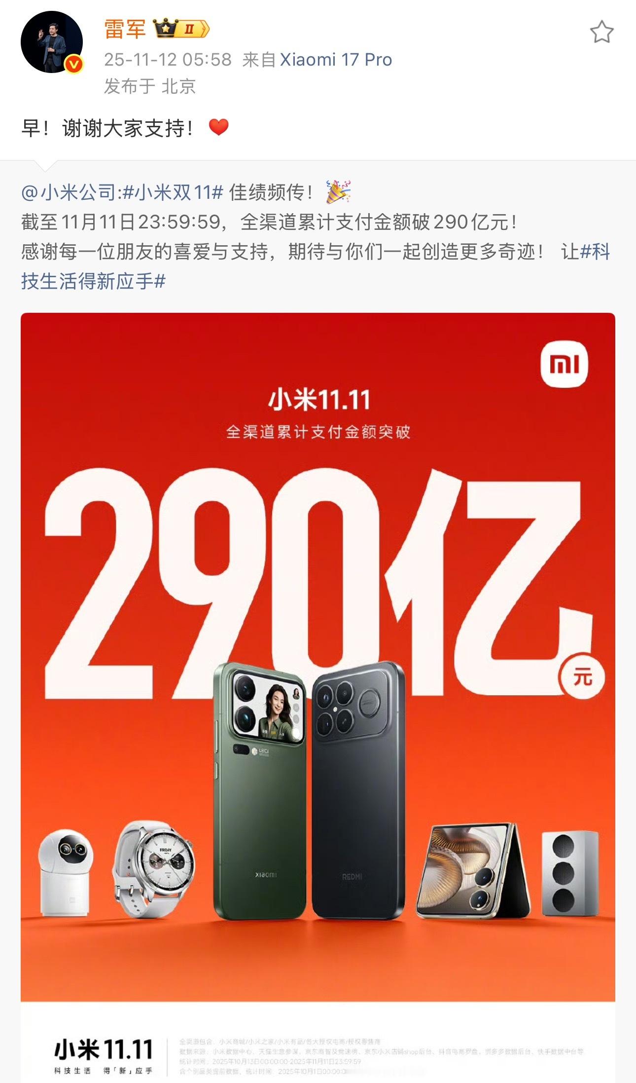 小米双十一期间全渠道支付金额破290亿!你贡献了没?