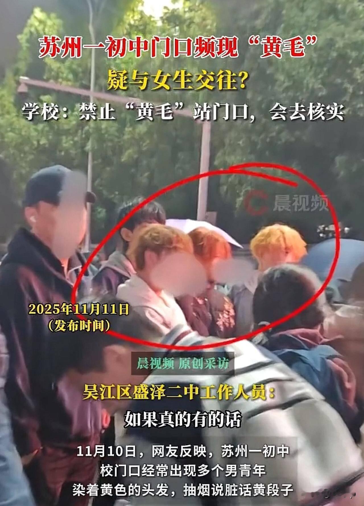 苏州一所中学的门口站了一群黄毛 说来也奇怪,他们是怎么做到全体统一的,每个地方都能看到这种人,很大程度应该就是看古惑仔学的,像这种群体都是早早辍学的,以后基本就定型了, 有一个词语形容的非常贴切,“癞蛤蟆爬脚面不咬人但膈应人”,学生家长们担心自己家的孩子如果跟这种群体扯上关系,得严防死守看护好。