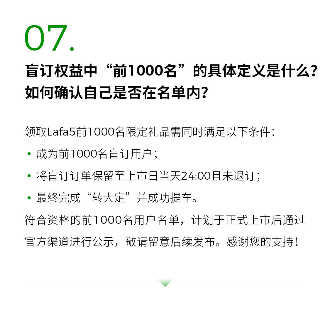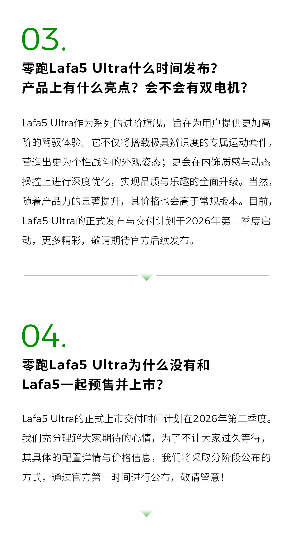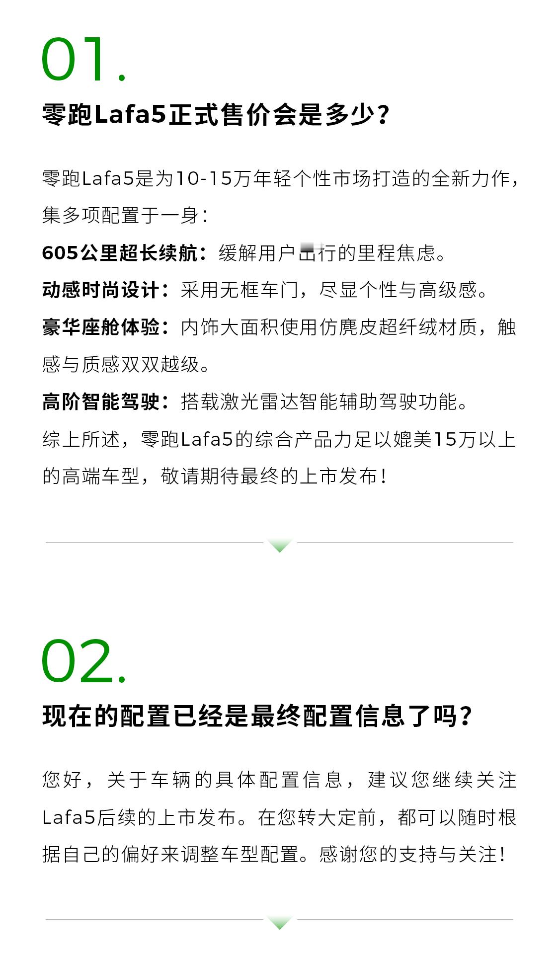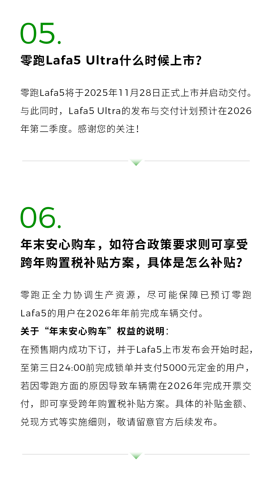 零跑Lafa5预售期答网友问热门问题逐一解答预售权益中的“年末安心购车权益”具体怎么补贴?盲订权益中“前1000名”的具体定义是什么?如何确认自己是否在名单内?……点击图片,查看回答