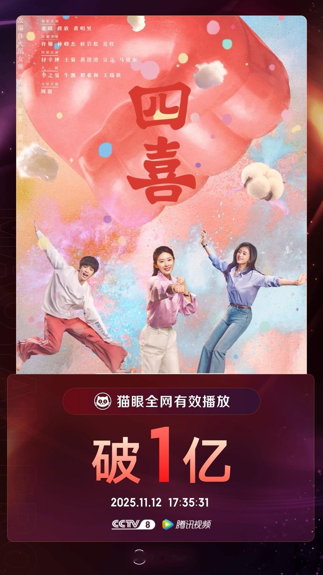 据猫眼专业版数据, 领衔主演的电视剧《四喜》热播中,有效播放量破亿!