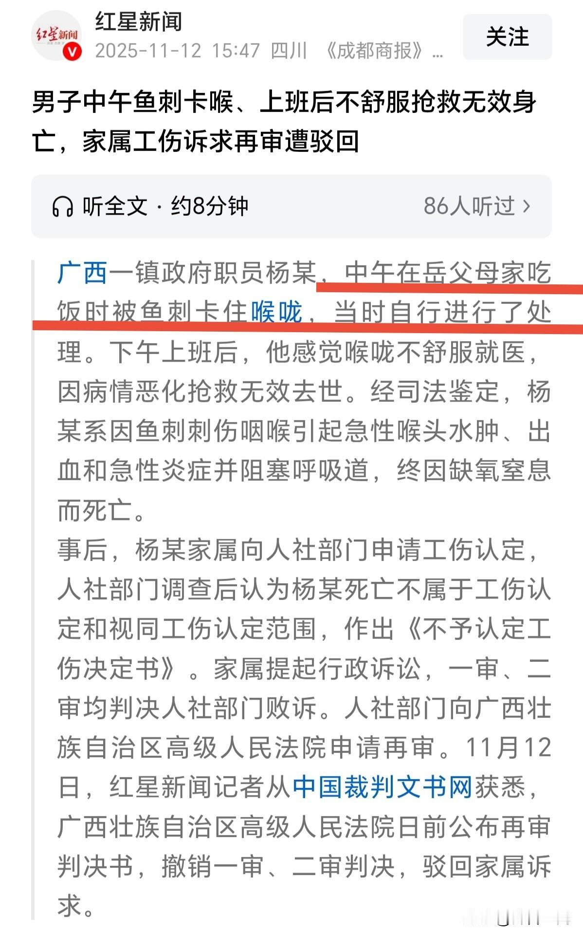 划重点,中午在岳父岳母家吃的饭,不是在单位食堂吃的,这个咋申请工伤呀。 被鱼刺卡了喉咙以后,没有及时去医院,自己处理了一下。估计就是喝醋或者用馒头噎下去了? 以后朋友们可得记住了,万一卡鱼刺了,千万别用老方法,鱼刺很容易扎破食道,甚至扎破气管。 被鱼刺卡住了,直接去医院,有现成的设备,把鱼刺夹出来就是了,很简单。