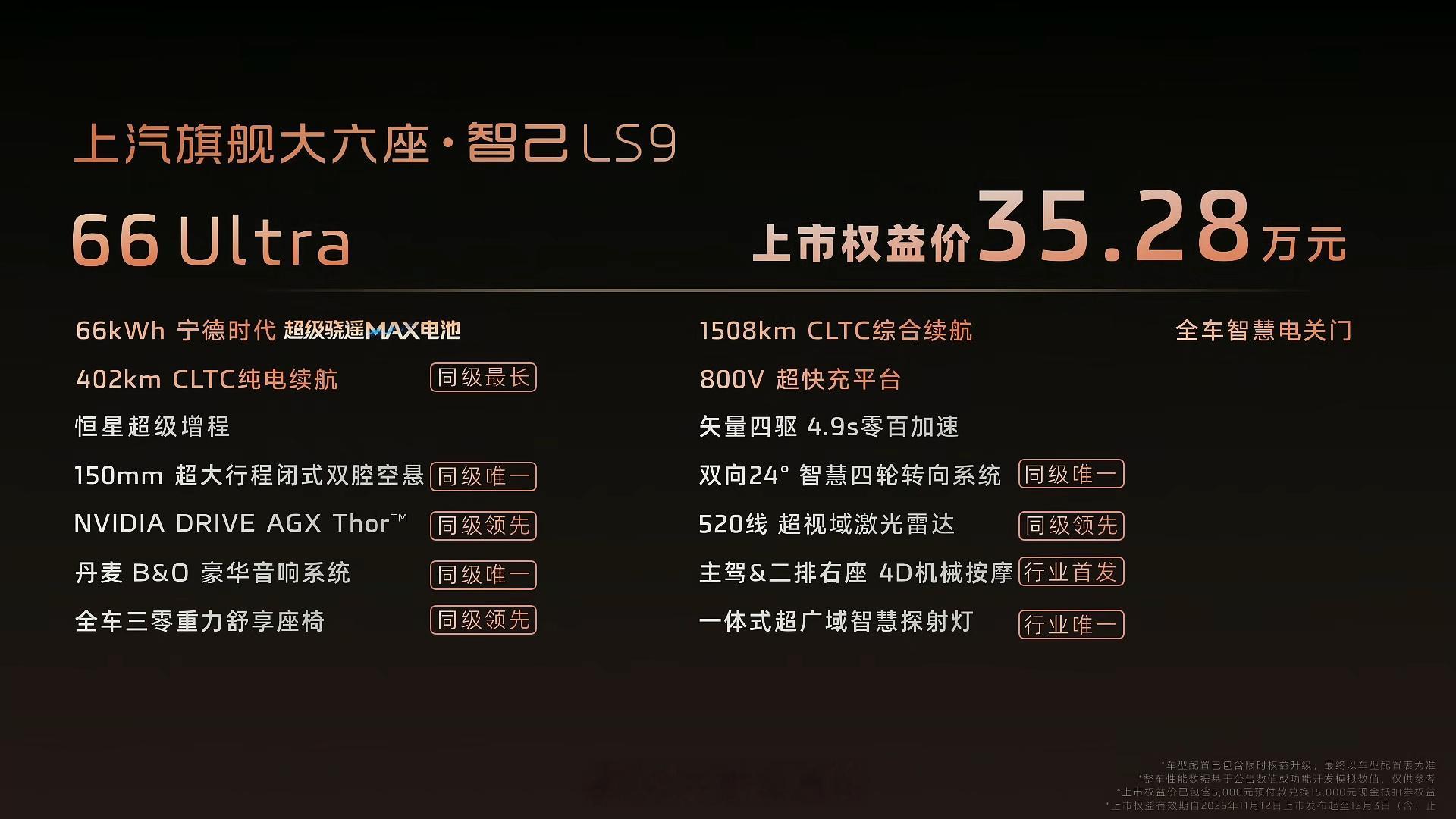 智己LS9正式售价公布 32.28w 起,11月12日24点前支付预付款更可享至高15000元购置税补贴。全系Ultra 标配1.5T四缸増程器+双电机,零百4.9s;搭配52度磷酸铁锂电池或66度三元锂电池,纯电续航里程分别为320km/402km,CLTC综合续航最长1508km。标配四驱、搭载灵蜥数字底盘3.0 前双叉臂、后多连杆、标配双腔空悬+CCD、后轮转向;全系标配520线激光雷达和Thor芯片,搭载IMAD Max辅助驾驶系统,具备城区领航能力;3个零重力座椅、标配B&O 7.1.4音响系统,25个扬声器总功率达3472W;首搭4D机械按摩可模拟人手推拿;更可选配石墨烯智控地暖系统,北方朋友的冬季福音。如此丰富的配置配上这个价格,大家觉得诚意足够嘛?