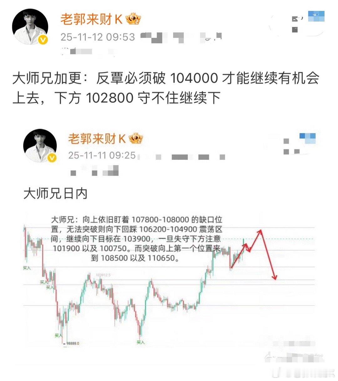 大师兄加更:反覃必须破 104000 才能继续有机会上去,下方 102800 守