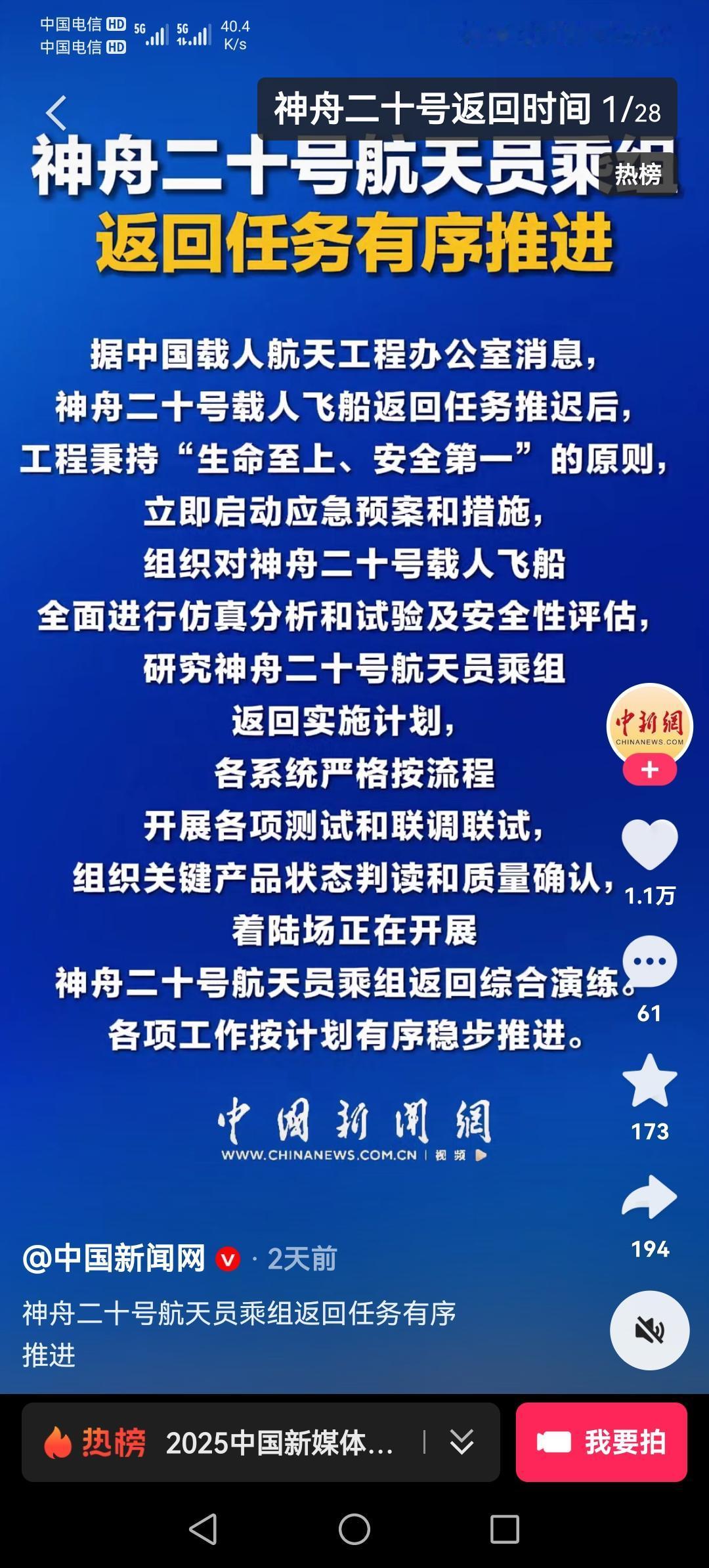 11 月 11 日,中国载人航天官网消息,神舟二十号航天员乘组正在实施返回计划,着陆场已经开展综合演练,这意味着经历空间碎片撞击风波后,航天员们很快就能平安回家了! 更让人期待的是,这次返回还可能把天宫空间站里那件 “功勋卓著” 的第二代 “飞天” 航天服带回地球,堪称航天版 “满载而归”。 时间回到 11 月 5 日,官方通报神舟二十号疑似遭空间微小碎片撞击,瞬间牵动无数人的心。然而,正是在那一瞬间,所有人都看到了中国航天人的坚韧与智慧。面对突如其来的危险,没有惊慌失措,没有退缩逃避,而是迅速反应、科学应对。这不仅仅是一场普通的航天任务,更是一场关于责任与担当的考验。 空间碎片,曾被视为太空的“隐形杀手”,如今成为了全球航天探索的共同难题。它提醒我们:在追求科技极限的道路上,没有一帆风顺。每一次“撞击”,都像是一记警钟,提醒我们必须不断创新、完善安全保障体系。中国航天人用实际行动告诉世界:只要心怀梦想,迎难而上,就没有克服不了的困难。 更令人振奋的是,神舟二十号的航天员们在危机中展现出的专业素养和坚韧不拔的精神,成为了新时代的英雄榜样。他们不是天生的超人,而是经过无数次训练、无数次考验,才能在危机时刻保持冷静、沉着应对。正是这种精神,激励着我们每一个普通人——面对生活中的困难与挑战,也要有“敢于迎难而上”的勇气。 而此次任务的“满载而归”,不仅仅是带回一件航天服,更象征着中国航天不断突破的精神力量。那件“功勋卓著”的第二代“飞天”航天服,见证了中国航天从无到有、从弱到强的辉煌历程。它是无数科学家、工程师无数个日夜努力的结晶,也是国家科技实力的象征。 这让我不禁思考:在我们每个人的生活中,又有多少“空间碎片”在阻碍我们的前行?或许是一次失败的尝试,或许是一次误解的冲突,但只要我们像航天员那样,保持冷静、勇于面对,就一定能“满载而归”。每一次跌倒,都是下一次飞跃的起点。 所以,看到神舟二十号的归来,我们不只是为航天员们的平安欢呼,更应从中汲取力量:在这个充满变数的时代,只要心怀梦想、勇于担当,就没有跨不过的坎,没有到不了的远方。中国航天的每一次突破,都是对国家、对人民最深沉的承诺,也是对我们每个人最真诚的激励。 让我们共同期待,神舟二十号的顺利归来,带回的不仅是航天服,更是属于每一个追梦人的勇气与希望。因为,只有不断向前,才能真正迎来属于我们的星辰大海。