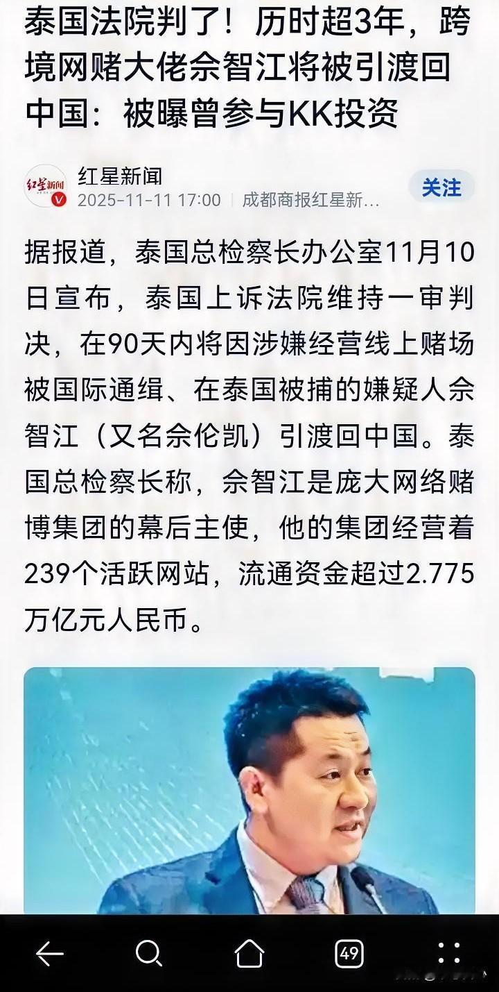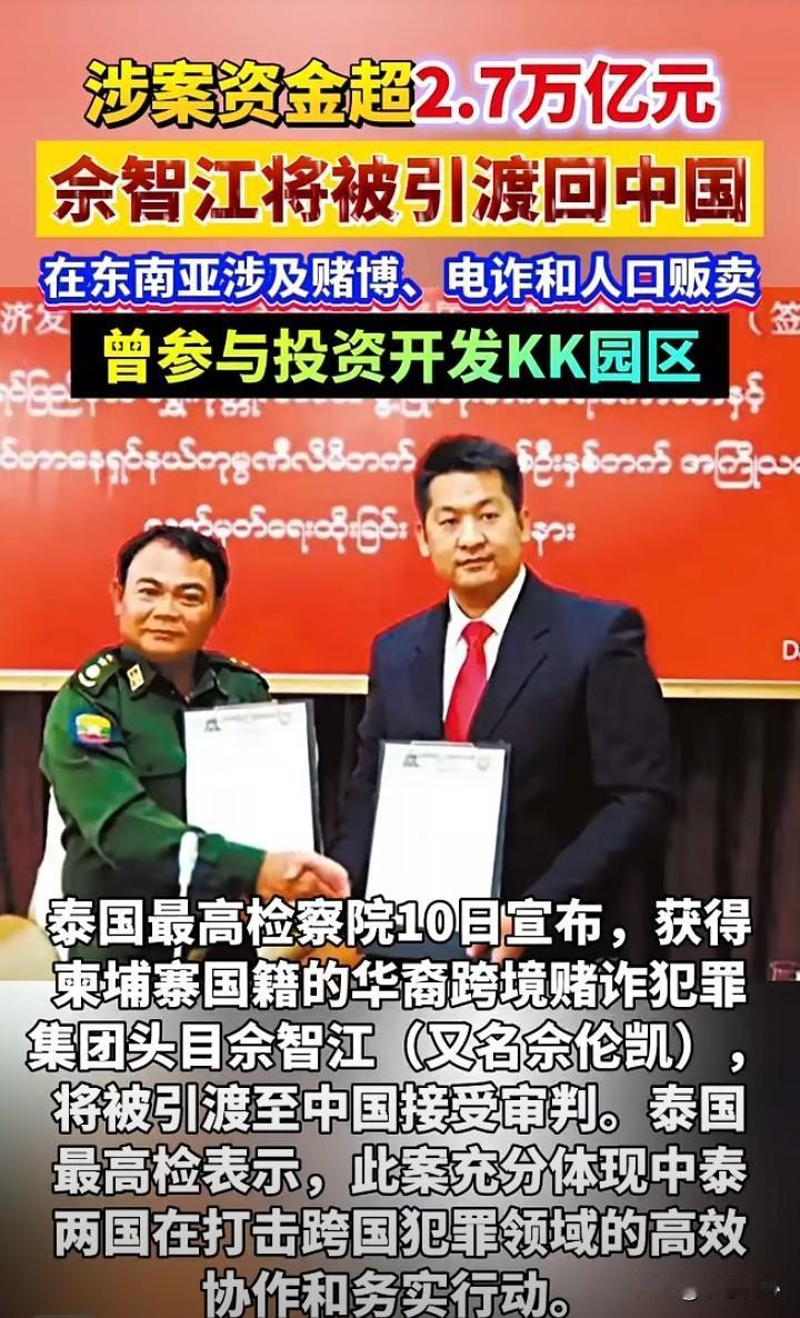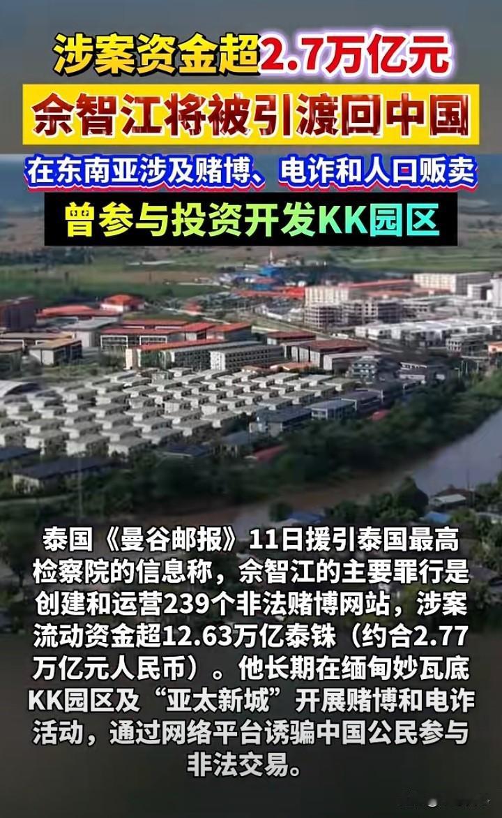 涉案金额达到2.77万亿元,这个害人无数(涉及赌博、电诈和人口贩卖)的佘伦凯(佘智江),隔着屏幕都感到他眼神里的狠劲。好在,他也终于被引渡回中国受审了! 不是不报,时候未到,果然应了我们中国古人的老话! 佘伦凯,此人1982年出生于湖南邵东,网上有人说是某明星黄有龙的表兄弟,也不知道真假。 但是,他在2012年先去菲律宾,做的是面向中国人的私彩平台、网络赌博网站等等。应该就在这里,佘伦凯赚取了大桶黑金。 因为,到2017年,佘伦凯获得柬埔寨公民身份后,高调宣布要斥资150亿美金,在缅甸东南部克伦邦的妙瓦底市,建设占地18万亩的“亚太智慧产业新城”。 所谓的亚太新城,要集“科技、赌博、娱乐、旅游、文化、农业”于一体,实际上建的就是赌场和诈骗园区。 《大公报》报道,这个亚太新城也被称为“KK园区”,还被视为整个东南亚人口贩卖链的最终站,被骗、贩卖到这里的,除了参与电诈等活动,假如被认为没有利用价值了,则被活着摘取器官,利用园区庞大的器官贩卖管道卖到国外…… 因此,佘伦凯不仅是多个跨国犯罪集团的头目,涉及非法赌博、电信诈骗及人口贩卖,是缅甸KK园区的重要控制者之一,更涉及非法禁锢、活摘器官及性情等令人发指的犯罪行为! 前天,泰国的总检察长表示,佘伦凯的网络赌博集团经营着239个活跃网站,流通资金超过2.775万亿元人民币。这是一个多么惊人的数字,假如依照赌博集团3-5个点的“抽水”,那就已经达到千亿资金规模,何况,十赌九输,这些流通资金如果原本是属于赌徒的,后续也可以认定慢慢就成了赌博集团的了。 本来,前天泰国方面还宣布,将于90天内将佘伦凯(2022年在泰国被捕)引渡回中国。90天,不会出什么变故吧? 想不到,今天就看到他被引渡回来了。 本来,佘伦凯在十几年前就被中国法院定罪(他未到场),一直被中国列为逃犯。 他不思悔改,在逃期间,还把犯罪行为扩展到无以复加的地步。想想他的网络赌博、电信诈骗害得多少人倾家荡产、家破人亡吧。 更别说他的KK园区里面发生的非法禁锢、活摘人体器官等令人发指的罪行! 在国家打掉缅北电诈犯罪集团,也开始对明家、魏家、白家等犯罪集团宣判后,现在又成功引渡回佘伦凯这号人物,也是在打击网赌电诈方面取得的又一成绩。 很多人热评说对佘伦凯要“凌迟” ,在如今的时代,这样的刑罚是做不到了,也枪毙不了他几十次。 但是,一个死刑总是可以的吧,期待着国家对佘伦凯的审判!