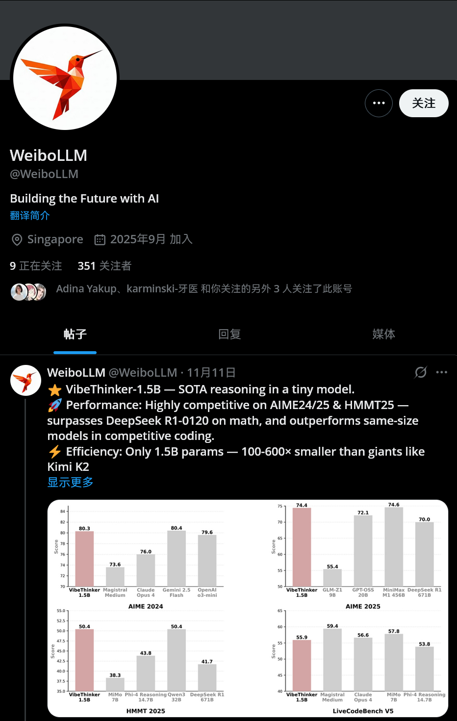 说个笑话,微博发布的新模型VibeThinker-1.5B ,跑到推上去发模型发布的新闻,自己微博平台上不发。