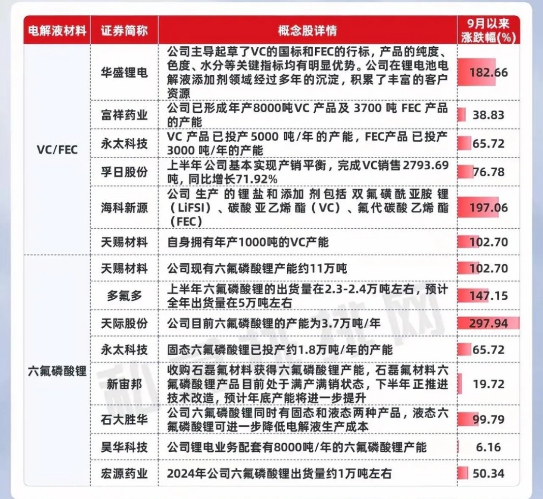 电解液核心材料优质企业全景解析本次解析聚焦电解液关键材料领域,全面覆盖20家核心企业的产能规模、技术亮点、产销表现等核心维度,同步纳入9月以来市场涨幅数据,直观呈现板块近期景气度。VC/FEC作为电解液性能提升的核心添加剂,六氟磷酸锂是电解液传导功能的关键锂盐,企业在这两大品类的产能布局、技术沉淀与客户资源,直接决定其行业竞争壁垒。重点企业深度拆解1. 华盛锂电(VC/FEC):作为VC国家标准与FEC行业标准的主导起草者,产品纯度等核心指标处于行业领先水平,深耕电解液添加剂领域多年,积累了稳定优质的客户资源。9月以来涨幅达182.66%,凭借过硬的产品竞争力与深厚的客户基础,稳居添加剂赛道头部地位。2. 富祥药业(VC/FEC):已建成年产8000建成年产8000吨VC、3700吨FEC的规模化产能,精准切入电解液关键添加剂赛道。依托充足的产能储备,高效匹配行业增长需求,9月以来涨幅38.83%,在添加剂供给端形成显著的规模优势。3. 永太科技(VC/FEC+六氟磷酸锂):构建多元化产品矩阵,VC年产能5000吨、FEC年产能3000吨,同时具备1.8万吨/年固态六氟磷酸锂产能,实现两大核心材料全覆盖。9月以来涨幅65.72%,全品类布局大幅提升产业链综合参与度与抗风险能力。4. 孚日股份(VC/FEC):上半年VC业务实现产销完美匹配,累计销量2793.69吨,同比大幅增长71.92%,产销数据表现亮眼。精准契合添加剂市场增长需求,9月以来涨幅76.78%,VC产品市场化落地进程位居行业前列。5. 海科新源(VC/FEC):打造LiFSI、VC、FEC等多品类电解液添加剂产品矩阵,产品覆盖范围广泛,完美适配下游材料多样化应用需求。9月以来涨幅197.06%,多元布局显著强化其在添加剂赛道的市场适配性与竞争力。6. 天赐材料(VC/FEC+六氟磷酸锂):电解液产业链一体化龙头企业,拥有1000吨/年VC产能,六氟磷酸锂年产能高达11万吨,构建起全产业链竞争优势。9月以来涨幅102.70%,庞大的产能规模与全链布局筑牢核心竞争壁垒。7. 多氟多(六氟磷酸锂):市场出货量稳居行业前列,上半年六氟磷酸锂出货量2.3-2.4万吨,预计全年出货量可达5万吨。9月以来涨幅147.15%,稳定的出货规模充分彰显其在锂盐市场的份额优势与行业认可度。8. 天际股份(六氟磷酸锂):六氟磷酸锂年产能达3.7万吨,产能规模处于行业中上游水平,具备充足的供给能力。9月以来涨幅297.94%,丰厚的产能储备使其在锂盐需求持续释放的背景下充分受益。9. 新宙邦(六氟磷酸锂):通过收购石磊氟材料快速获取六氟磷酸锂产能,目前生产线满产满销,供需衔接顺畅。下半年计划通过技术改造扩大产能,产能释放节奏清晰明确,9月以来涨幅19.72%,扩产计划将进一步提升其锂盐市场份额。10. 石大胜华(六氟磷酸锂):创新布局固态、液态双形态六氟磷酸锂产品,其中液态产品可有效降低电解液制备成本,技术差异化优势突出。9月以来涨幅99.79%,特色产品显著提升其在锂盐市场的核心竞争力。11. 昊华科技(六氟磷酸锂):依托自身业务生态配套布局锂电材料,建成8000吨/年六氟磷酸锂产能,形成业务协同优势。9月以来涨幅6.16%,凭借配套产能支撑,成为锂盐赛道具备独特竞争优势的标的。12. 宏源药业(六氟磷酸锂):2024年六氟磷酸锂出货量约1万吨,在锂盐赛道占据一定市场份额,具备稳定的市场参与度。9月以来涨幅50.34%,扎实的出货数据反映其在行业内的市场地位与客户认可度。13. 华塑锂电(VC/FEC):专注于电解液添加剂领域,聚焦VC核心品类,产能布局精准契合行业供需紧平衡趋势。近期受益于添加剂价格上涨,产品提价直接带动利润增厚,是赛道中具备高业绩弹性的优质标的。14. 三美股份(六氟磷酸锂):依托自身氟化工产业基础,稳步拓展六氟磷酸锂产能,产能释放节奏与锂盐需求增长趋势高度契合。氟化工与锂电材料的协同布局,为业务拓展打开广阔空间,具备持续成长潜力。15. 光华科技(电解液添加剂):深耕电解液添加剂等锂电材料领域,产品布局紧密贴合新能源行业发展需求,持续推进技术研发与产品迭代。近期行业热度攀升带动业务关注度显著提升,是赛道中极具潜力的成长型标的。16. 江苏国泰(电解液及添加剂):构建高度一体化的产业链布局,以电解液业务为核心,配套开展添加剂生产,依托电解液产能有效带动添加剂内部需求,同时积极拓展新产能。综合化布局持续强化其行业竞争优势,抗风险能力突出。17. 奥克股份(电解液溶剂+添加剂):凭借精细化工产业积淀,拓展电解液溶剂及部分添加剂业务,产品矩阵逐步丰富完善。在行业需求持续增长的背景下,锂电材料相关业务营收贡献有望持续提升,成长动能充足。18. 瑞泰新材(电解液添加剂):聚焦电解液添加剂核心赛道,储备了充足的产能与领先的技术,在近期添加剂供需紧张的市场环境下,产品出货量与价格同步实现稳步改善,是赛道中成长属性鲜明的优质标的。19. 延安必康(六氟磷酸锂):充分整合自身产业资源,积极布局六氟磷酸锂产能,产能逐步落地并释放供给,精准契合锂盐市场需求趋势。赛道布局持续完善,逐步构建起在锂电材料领域的竞争优势。20. 美联新材(电解液添加剂):依托新材料产业基础,跨界切入电解液添加剂领域,产品研发与产能布局同步推进,节奏稳健。随着行业热度持续提升,相关业务市场关注度逐步增加,成长潜力值得期待。行业总结本次梳理的20家企业全面覆盖电解液核心材料VC/FEC与六氟磷酸锂两大关键品类,既包含具备