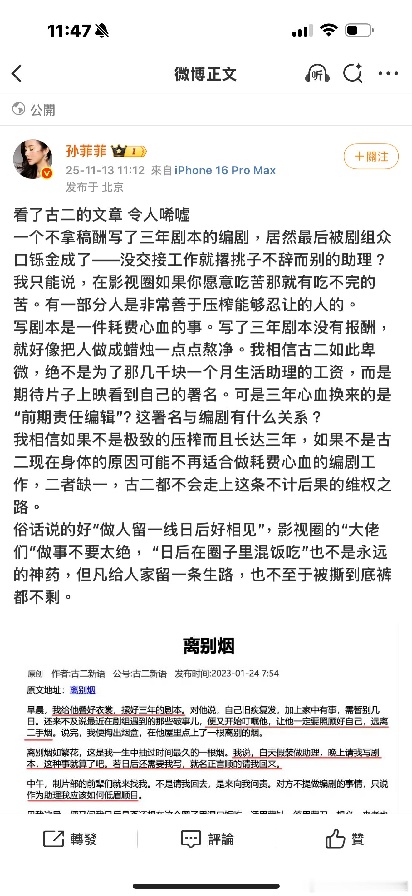 孙菲菲发文支持古二,这应该是第一个出来公开支持古二的艺人,虽然说现在人不是很红了