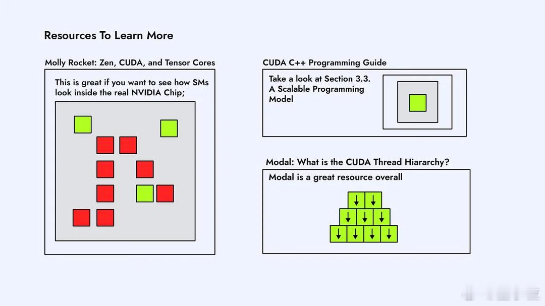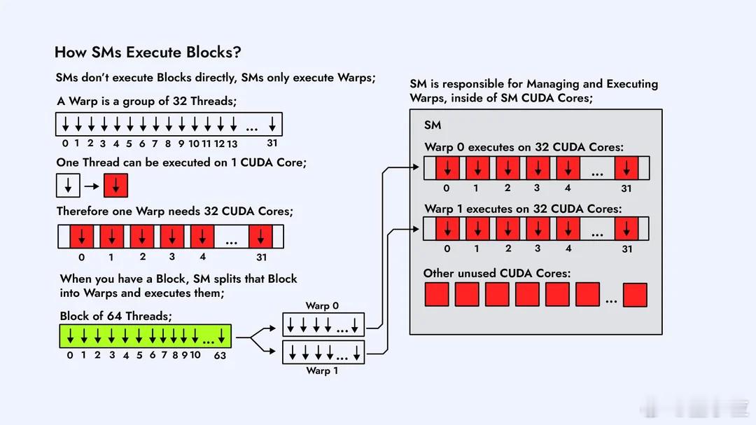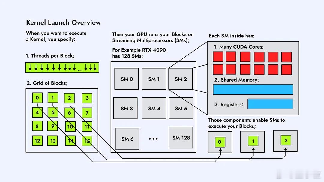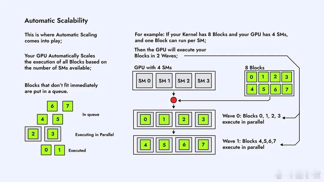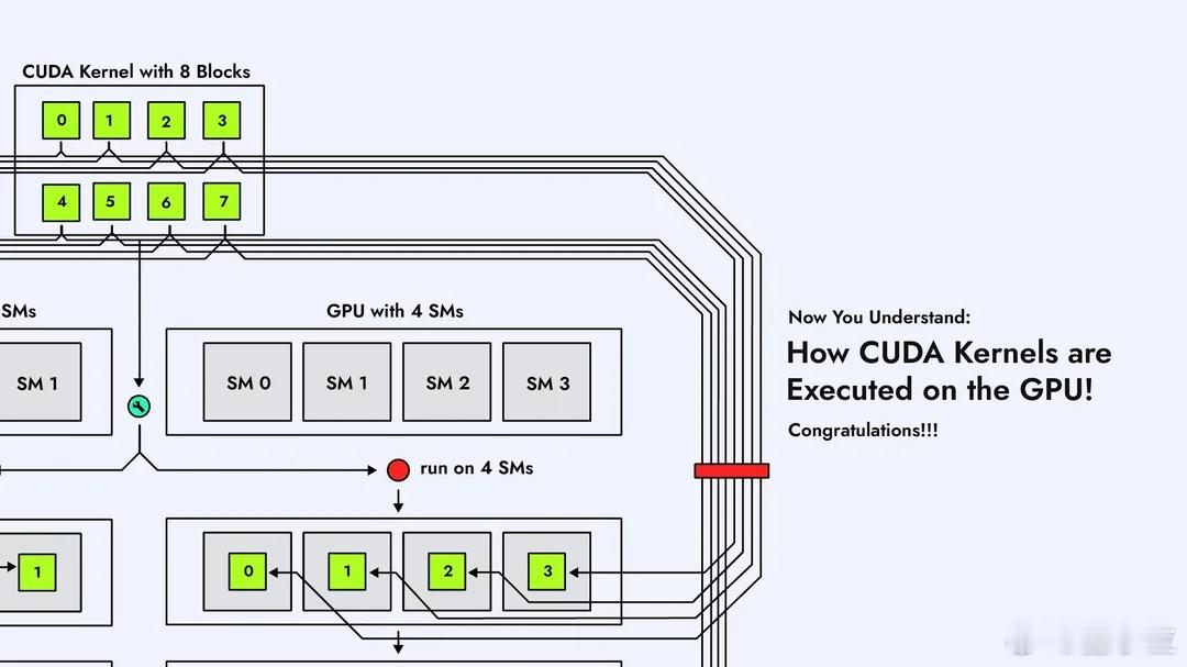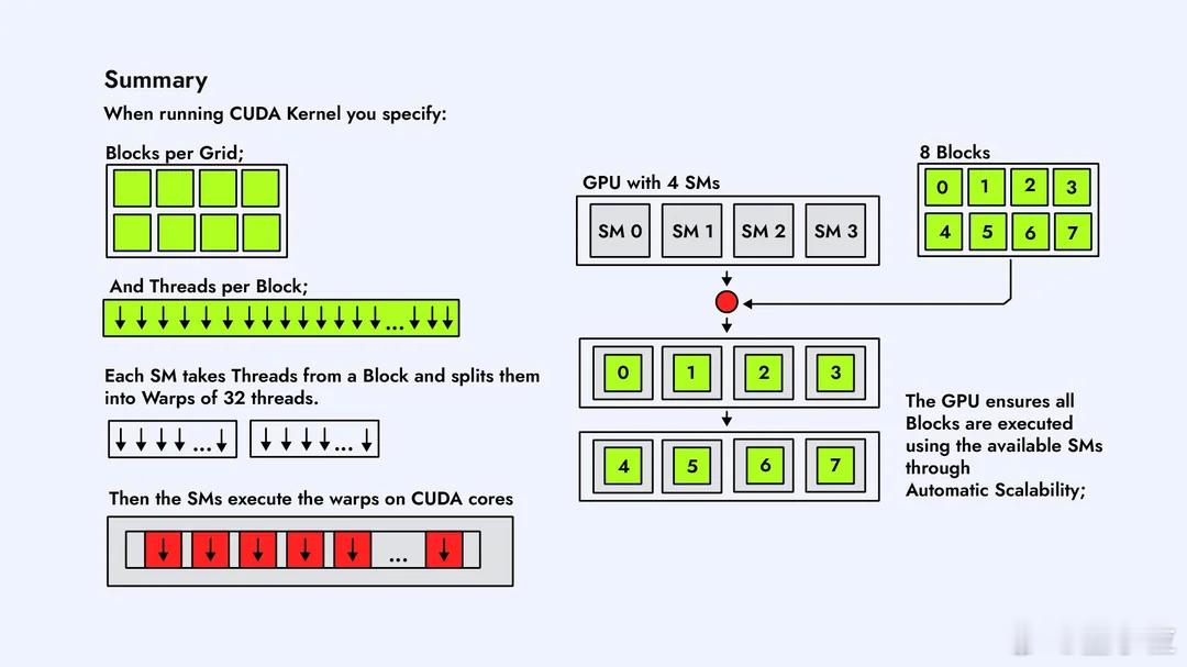 CUDA内核在GPU上是怎么执行的?Reddit大神这组图片,不懂CUDA的人看了也能有直观概念。【图1】在GPU上跑一个CUDA Kernel,第一步是把任务拆成一个大的线程网格Grid,里面塞满一个个Block。这个Grid就是“要完成的全部工作量”,Block就是被分成的小任务。【图2】GPU内部有很多个SM(Streaming Multiprocessor),它们是负责运算的“小机器”。每个Block会被自动分配到某个SM上去跑,一个SM一次能接多少Block,要看它的硬件资源。【图3】Block不会直接跑,到了SM里会再被切成一个个Warp。Warp由32条线程组成,是GPU真正调度的单位。可以理解为:Block是任务包,Warp才是上机干活的小队。【图4】一个Warp的32条线程,会被塞进SM内部的CUDA Core里执行。Core数量够,Warp就能一次性跑完;Core不够,多出来的Warp就只能排队等位置。【图5】SM里有Warp调度器,它决定哪个Warp先跑、哪个先停。并不是所有Warp一起执行,而是调度器轮流“点名”。所以GPU高速,但也是有节奏的。【图6】如果Grid里的Block数量比SM数量多,就会出现“排队”。SM忙不过来,多出来的Block会先放在队列里,等前面的跑完再补上,这个过程完全自动。【图7】不同Block之间怎么调度、什么时候上SM,不需要开发者操心,GPU会自己做资源分配。我们只需要告诉它Block和线程数量,剩下就是GPU的事。【图8】 最后一张是整个执行流程的总结:Grid → Block → Warp → Thread,再到SM和CUDA Core。所有Block都会被GPU按SM数量分批跑完,实现自动扩展和并行。总体来看,这组图讲的很清楚了,如果后续再加一套图,把共享内存访问、L1/L2缓存、bank conflict这些讲清楚,会更接近真正的CUDA性能优化流程。原图地址:www.reddit.com/r/CUDA/comments/1ofvfpe/how_cuda_kernels_are_executed_on_the_gpu/