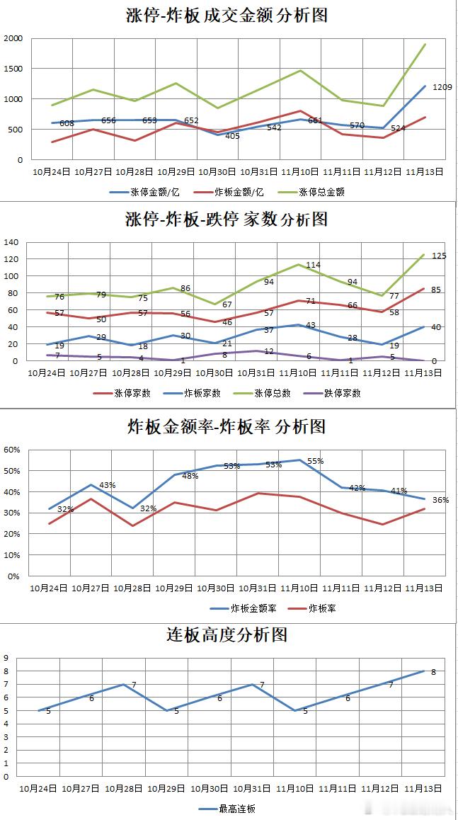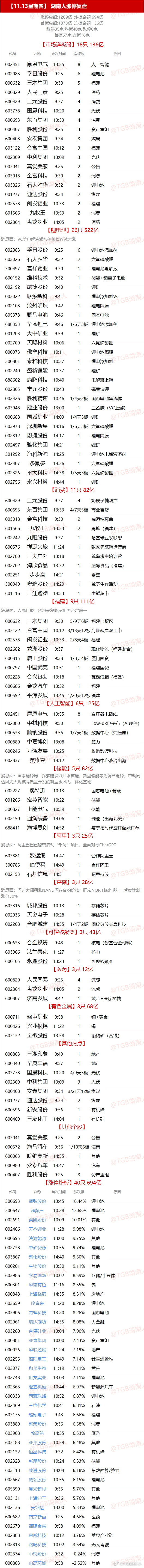 【11.13星期四】 湖南人涨停复盘 "涨停金额:1209亿 炸板金额:694亿首板金额:1073亿 连板金额:136亿涨停85家 炸板40家 跌停0家首板67家 连板18家" 【市场连板股】18只 136亿 代码 名称 末次时间 连板数 原因002451 摩恩电气 13:55 8 人工智能002083 孚日股份 9:25 6 锂电池000632 三木集团 9:30 5 福建600829 人民同泰 9:25 4 医药600429 三元股份 9:37 4 消费603778 国晟科技 10:20 4 光伏600693 东百集团 13:33 4 消费000407 胜利股份 9:25 3 资产重组600408 安泰集团 9:34 3 煤炭603122 合富中国 10:12 3 福建002309 中利集团 13:09 3 光伏003041 真爱美家 9:25 2 公告003018 金富科技 9:30 2 消费603026 石大胜华 9:32 2 锂电池001277 速达股份 9:34 2 煤炭002578 闽发铝业 10:33 2 福建601566 九牧王 13:53 2 消费002864 盘龙药业 14:05 2 医药【锂电池】26只 522亿 消息面:VC等电解液添加剂价格连续大涨 002083 孚日股份 9:25 6 锂电池添加剂603026 石大胜华 9:32 2 六氟磷酸锂300497 富祥药业 9:30 1 锂电池电解液600152 维科技术 9:32 1 储能+钠离子电池002192 融捷股份 9:40 1 锂矿003022 联泓新科 9:41 1 锂电添加剂VC002108 沧州明珠 9:42 1 锂电隔膜605378 野马电池 9:46 1 固态电池 688353 华盛锂电 9:46 1/6天3板 锂电池添加剂001203 大中矿业 9:59 1 锂矿002709 天赐材料 10:06 1 六氟磷酸锂000973 佛塑科技 10:11 1 锂电池隔膜300801 泰和科技 10:37 1 锂电添加剂002240 盛新锂能 10:37 1 锂矿688602 康鹏科技 10:40 1 电解液上游002805 丰元股份 10:43 1 磷酸铁锂002426 胜利精密 10:46 1/4天2板 固态电池集流体603948 建业股份 13:00 1 三乙胺(VC上游)000688 国城矿业 14:03 1/4天3板 锂矿603978 深圳新星 14:16 1/6天3板 六氟磷酸锂002812 恩捷股份 14:17 1 锂电隔膜002497 雅化集团 14:21 1 锂矿301292 海科新源 14:25 1 锂电池电解液溶剂002407 多氟多 14:36 1 六氟磷酸锂002326 永太科技 14:38 1/5天3板 六氟磷酸锂002756 永兴材料 14:44 1 锂矿【消费】11只 82亿 600429 三元股份 9:37 4 奶皮子糖葫芦600693 东百集团 13:33 4/7天5板 商业百货003018 金富科技 9:30 2 啤酒拉环盖601566 九牧王 13:53 2 男裤(福建)002242 九阳股份 9:37 1 哈基米豆浆联想600576 祥源文旅 11:24 1 张家界旅游运营商002780 三夫户外 13:18 1 荒岛求生培训营002702 海欣食品 13:32 1 速冻食品(福建)002251 步步高 14:21 1 零售300949 奥雅股份 14:29 1 荒野生存活动601116 三江购物 14:53 1 生鲜超市【福建】9只 111亿 消息面:人民日报:台湾光复昭示祖国必定统一 000632 三木集团 9:30 5/9天6板 福建自贸区603122 合富中国 10:12 3/13天12板 海峡两岸双上市002578 闽发铝业 10:33 2/8天4板 福建002682 龙洲股份 9:37 1 现代物流(福建龙岩)600815 厦工股份 9:38 1/8天4板 厦门国资000797 中国武夷 10:51 1 福建国资002228 合兴包装 13:18 1 瓦楞纸箱(福建)600686 金龙汽车 13:32 1 福建000592 平潭发展 13:45 1/20天12板 福建【人工智能】6只 125亿 002451 摩恩电气 13:55 8 变压器电磁线002080 中材科技 9:50 1 Low-dk电子布(AI硬件)000533 顺钠股份 9:56 1/7天4板 数据中心(变压器)000889 中嘉博创 13:08 1 算力600246 万通发展 13:25 1 收购数渡科技002837 英维克 14:12 1 数据中心液冷出海【储能】5只 82亿 消息面:国家能源局:探索建设以抽水蓄能、新型储能等为调节电源,带动周边风光大规模高质量开发的新型水风光一体化基地 002227 奥特迅 10:13 1 固态电池+储能001266 宏英智能 10:22 1 储能300827 上能电气 10:39 1 储能002150 通润装备 14:06 1 储能(出海北美)688411 海博思创 14:52 1 与宁德时代签订储能订单【阿里】3只 25亿 消息面:阿里巴巴已秘密启动“千问”项目,全面对标ChatGPT 603881 数据港 14:47 1 合作阿里云300785 值得买 14:49 1 合作阿里002153 石基信息 14:51 1 阿里持股【存储】3只 28亿 消息面:闪迪大幅调涨NAND闪存合约价格;旺宏NOR Flash明年一季度计划涨价30% 603316 诚邦股份 10:13 1 存储芯片002935 天奥电子 10:28 1 存储芯片002208 合肥城建 14:55 1/4天2板 间接参股长鑫科技【可控核聚变】3只 43亿 000633 合金投资 9:48 1 核电(镍基合金材料)603966 法兰泰克 11:27 1 核电600105 永鼎股份 13:23 1 可控核聚变【医药】3只 12亿 600829 人民同泰 9:25 4 流感002864 盘龙药业 14:05 2 流感600807 济高发展 9:42 1 黄金+医疗器械【有色金属】3只 68亿 600711 盛屯矿业 9:58 1 铜+黄金000426 兴业银锡 11:22 1 锡603132 金徽股份 13:58 1 铅精矿(含银)【其他热点】 000863 三湘印象 9:49 1 地产600340 华夏幸福 9:57 1 地产603778 国晟科技 10:20 4/9天5板 光伏002309 中利集团 13:09 3 光伏600408 安泰集团 9:34 3/21天12板 煤炭001277 速达股份 9:34 2 煤炭600596 新安股份 9:56 1 有机硅600409 三友化工 14:04 1 有机硅【其他个股】 003041 真爱美家 9:25 2 公告000572 海马汽车 9:36 1/10天6板 海南600063 皖维高新 14:55 1 其他000980 众泰汽车 14:47 1 汽车000407 胜利股份 9:25 3 资产重组【涨停炸板】40只 694亿 代码 名称 首次时间 涨跌幅 原因300693 盛弘股份 13:45 18.44% 锂电池300647 超频三 10:28 13.68% 锂电池002691 冀凯股份 10:09 10.01% 其他002466 天齐锂业 11:28 9.98% 锂电池000695 滨海能源 13:00 9.75% 其他002738 中矿资源 10:55 9.74% 锂电池603867 新化股份 14:40 9.50% 其他600201 生物股份 13:30 9.11% 其他603986 兆易创新 10:02 8.59% 存储/半导体600301 华锡有色 11:16 8.55% 锡600848 上海临港 14:35 8.31% 房地产603659 璞泰来 11:20 8.28% 锂电池603906 龙蟠科技 13:20 8.26% 固态电池002961 瑞达期货 14:35 8.08% 大金融603260 合盛硅业 13:04 7.90% 光伏600881 亚泰集团 10:00 7.43% 资产重组000036 华联控股 11:24 7.1