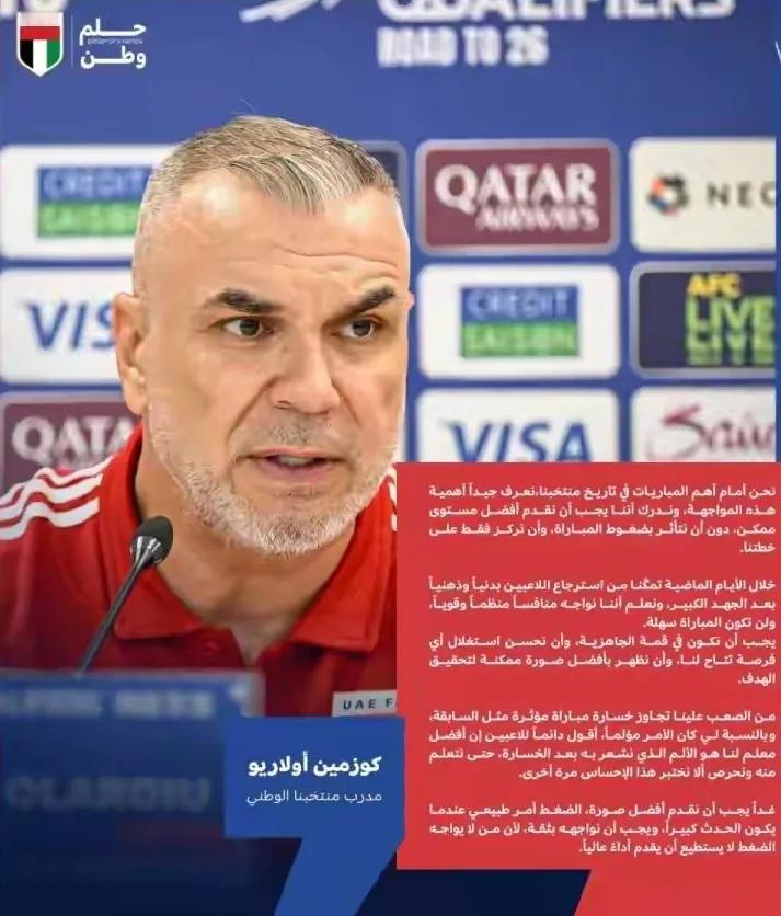 阿联酋主场对阵伊拉克,今晚双方将为世界杯附加赛0.5个名额拼死一战,双方打2个回合,胜者参加洲际附加赛,和其它洲争最后1个世界杯名额。 阿联酋和伊拉克双方在过去6次交锋中,伊拉克2胜3平1负略占优势,双方最近3次交手都是平局,伊拉克防守稳定,今晚双方有可能再次打平,但是阿联酋主场必须取胜,打平或输球就凶多吉少了,阿联酋主帅奥拉罗优表示:“到了阿联酋国家队历史上最关键的时刻,必须全力以赴!”双方鹿死谁手,让我们拭目以待吧!