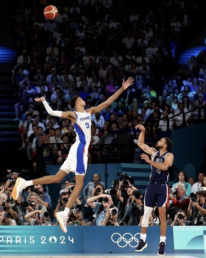 果然有对比图! 今天看比赛的时候,就觉得库里迎着文班亚马投出的这个三分,很像去年的奥运会决赛的那个三分,网上搜了一下,果然就看到了这两球的对比图,不过奥运会那张图看着更有视觉冲击力,角度什么的抓拍的太好了…… 文班亚马比库里高了三十多厘米,再加上他那两个大长胳膊,那种铺天盖地的防守,压迫力太大了。想想自己打球的时候遇上个比我高二十厘米的,就已经被防的没脾气了……