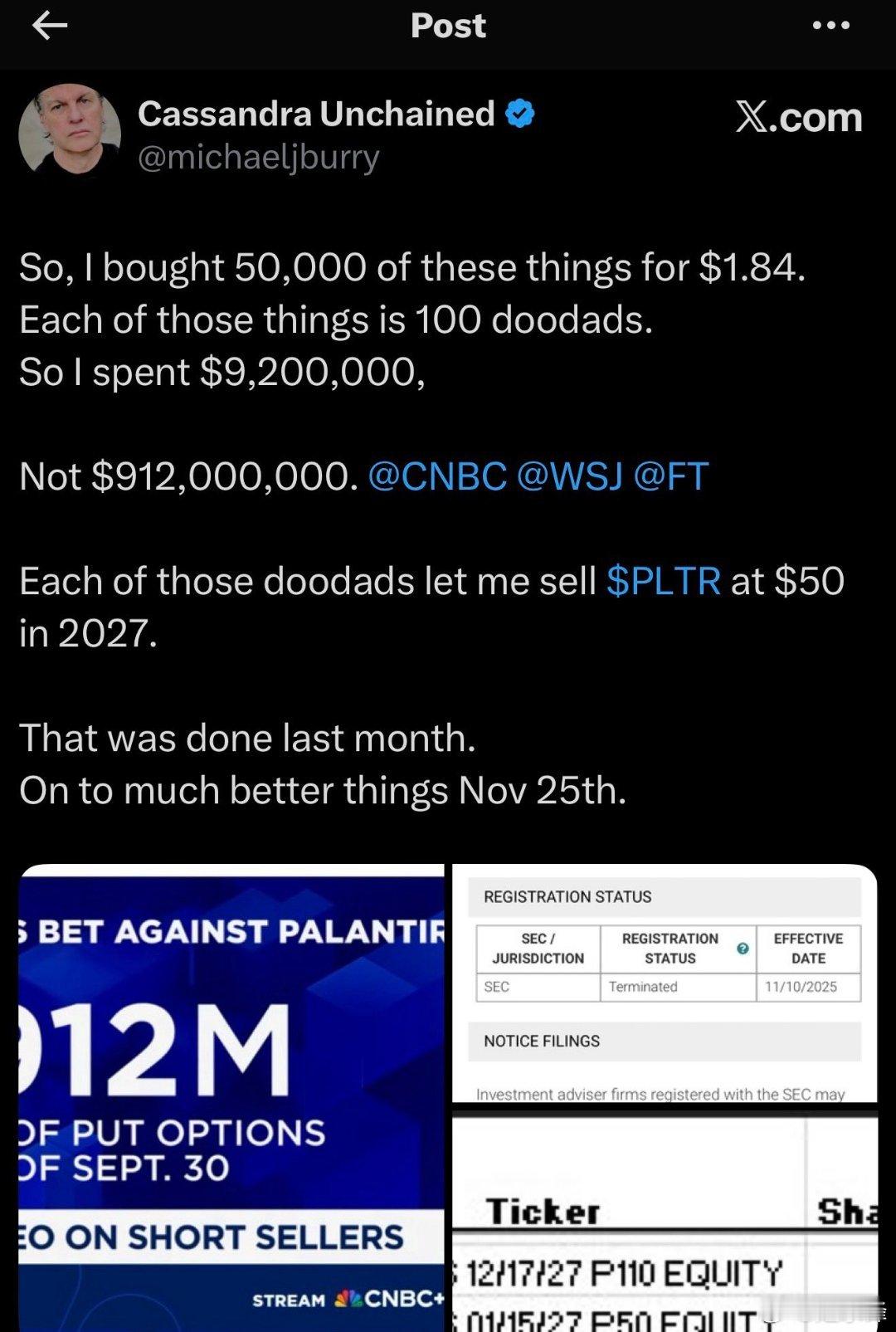 看Burry最新帖子,他自己就花了9.2M买个远期卖出期权,媒体炒作成9.12亿