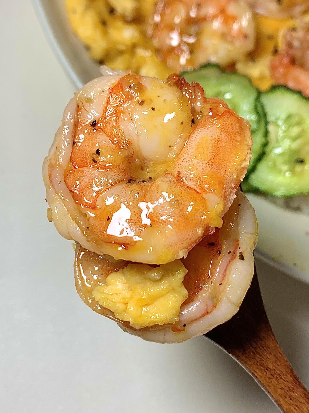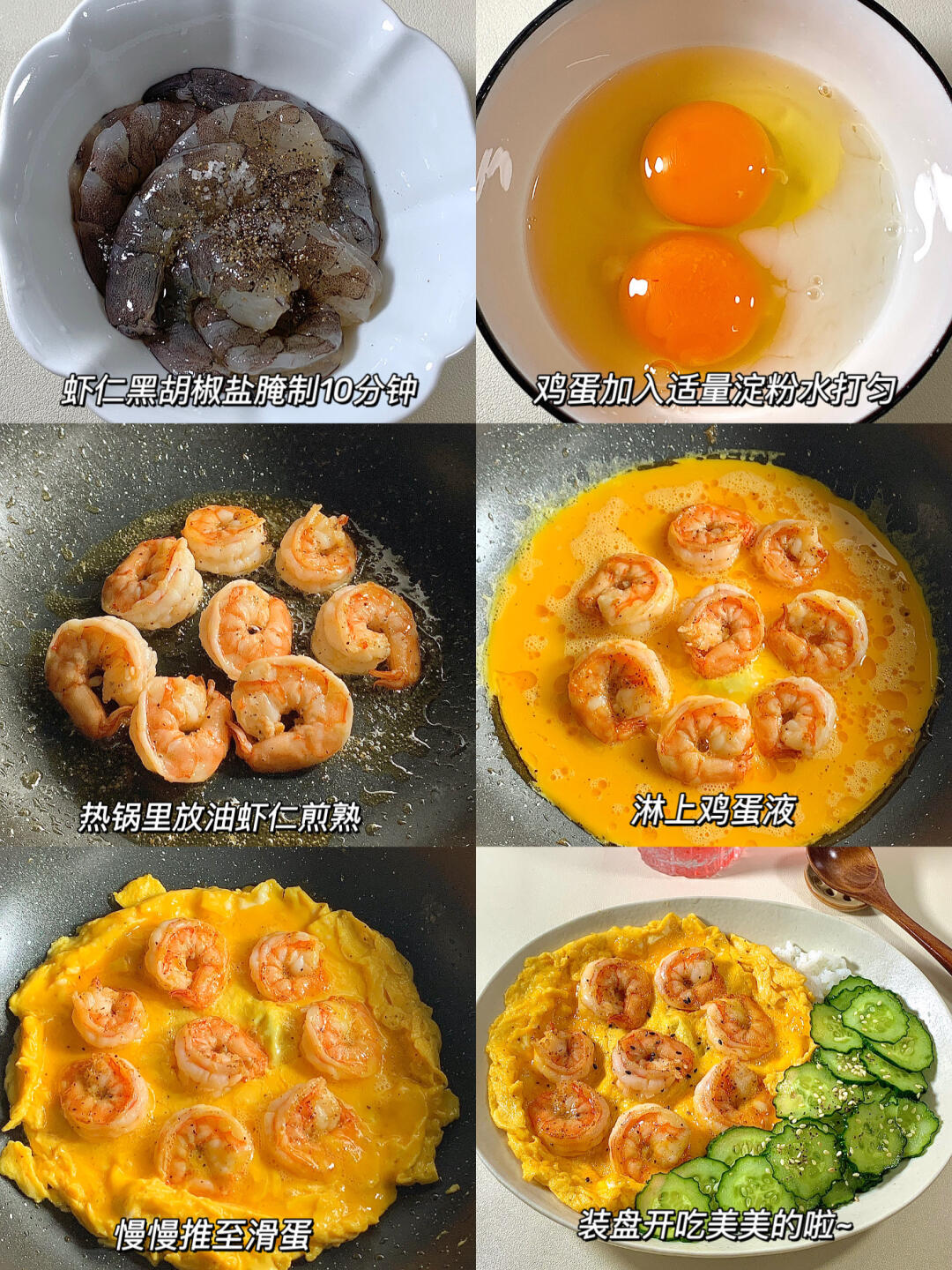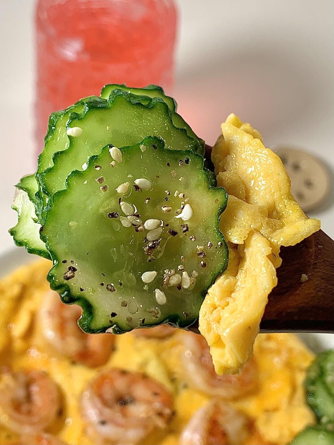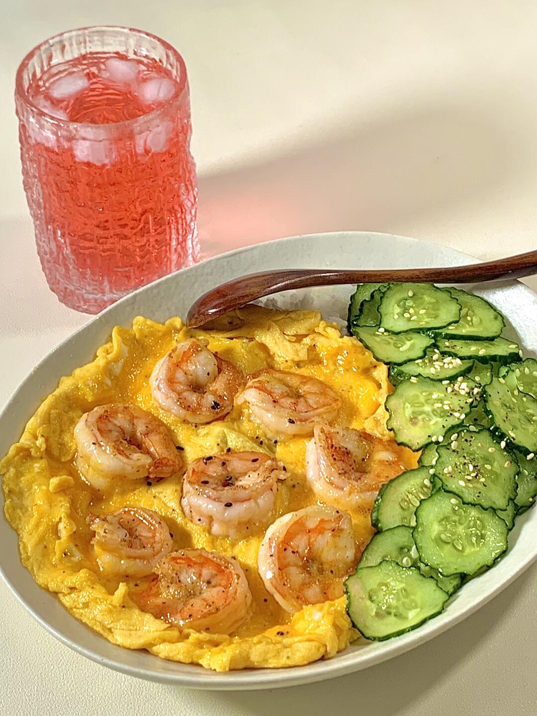 今日减脂餐虾仁滑蛋!巨鲜美😋 📝食材:虾仁、鸡蛋、凉拌黄瓜、少许米饭 ✨做法: 1️⃣黄瓜切片+适量盐杀出水份+适量蒜未+白芝麻+1勺芝麻油拌均即可✅ 2️⃣虾仁+姜片+黑胡椒盐腌制10分钟 3️⃣锅里喷油把虾仁煎熟 淋上鸡蛋液慢慢推成滑嫩就熟啦~ 简单易做!姐妹们快去试试[派对R] 🍃装盘开吃啦[色色R]