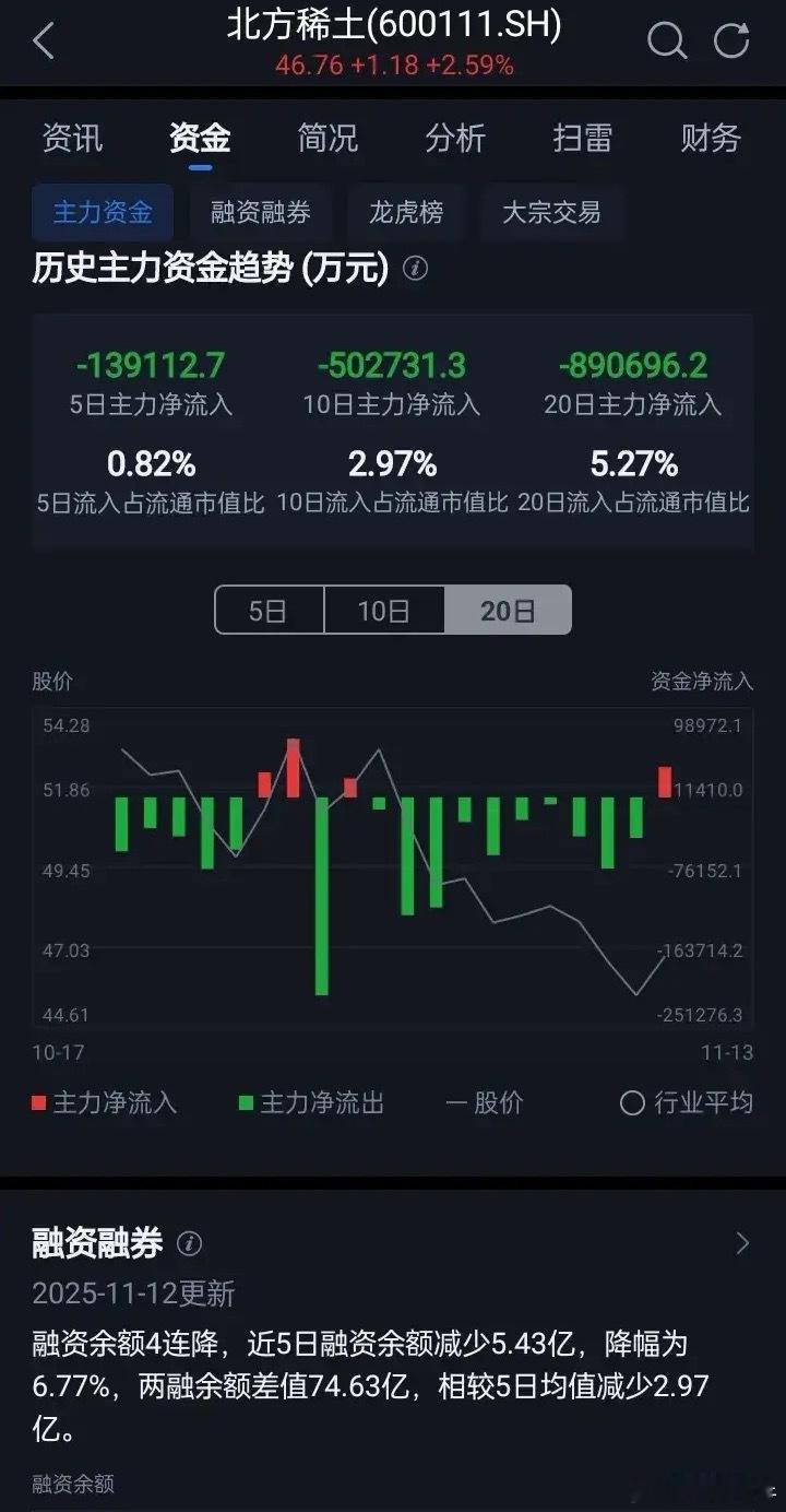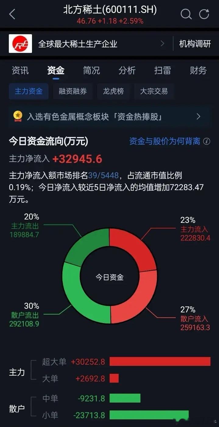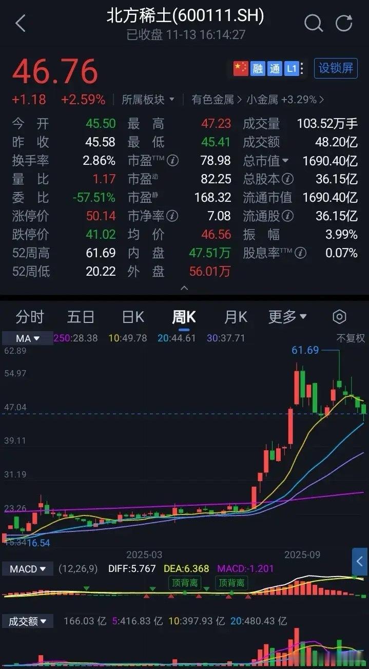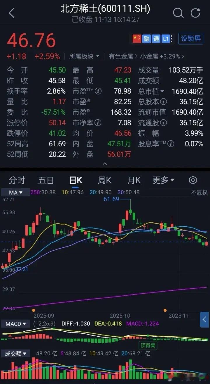 北方稀土收于46.76元,涨2.59%,换手率2.86%,成交量103.52万,成交额为48.2亿,主力资金净流入3.2945亿元。 主力流入3.3亿就涨了2.59%,北稀确实抗跌;北稀不抗涨,只要有一点点资金净流入,就大幅上涨。在这里做主力真是爽。感情上,觉得北稀上涨容易,下跌难度较大;技术上北稀最好就是横盘,MACD快慢线都在水下,没有超级大利好,还是会继续潜在零轴下方,空头的力量始终更强。