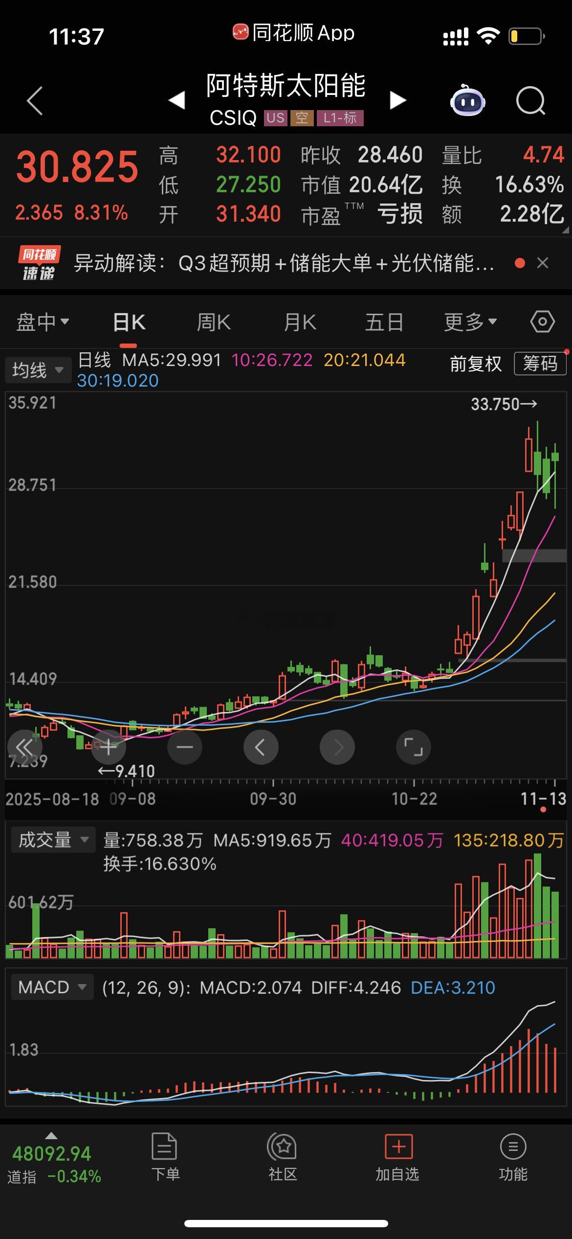 周四,阿特斯太阳能(CSIQ.US)盘前涨超7%,截至昨日收盘月内累涨37%,现