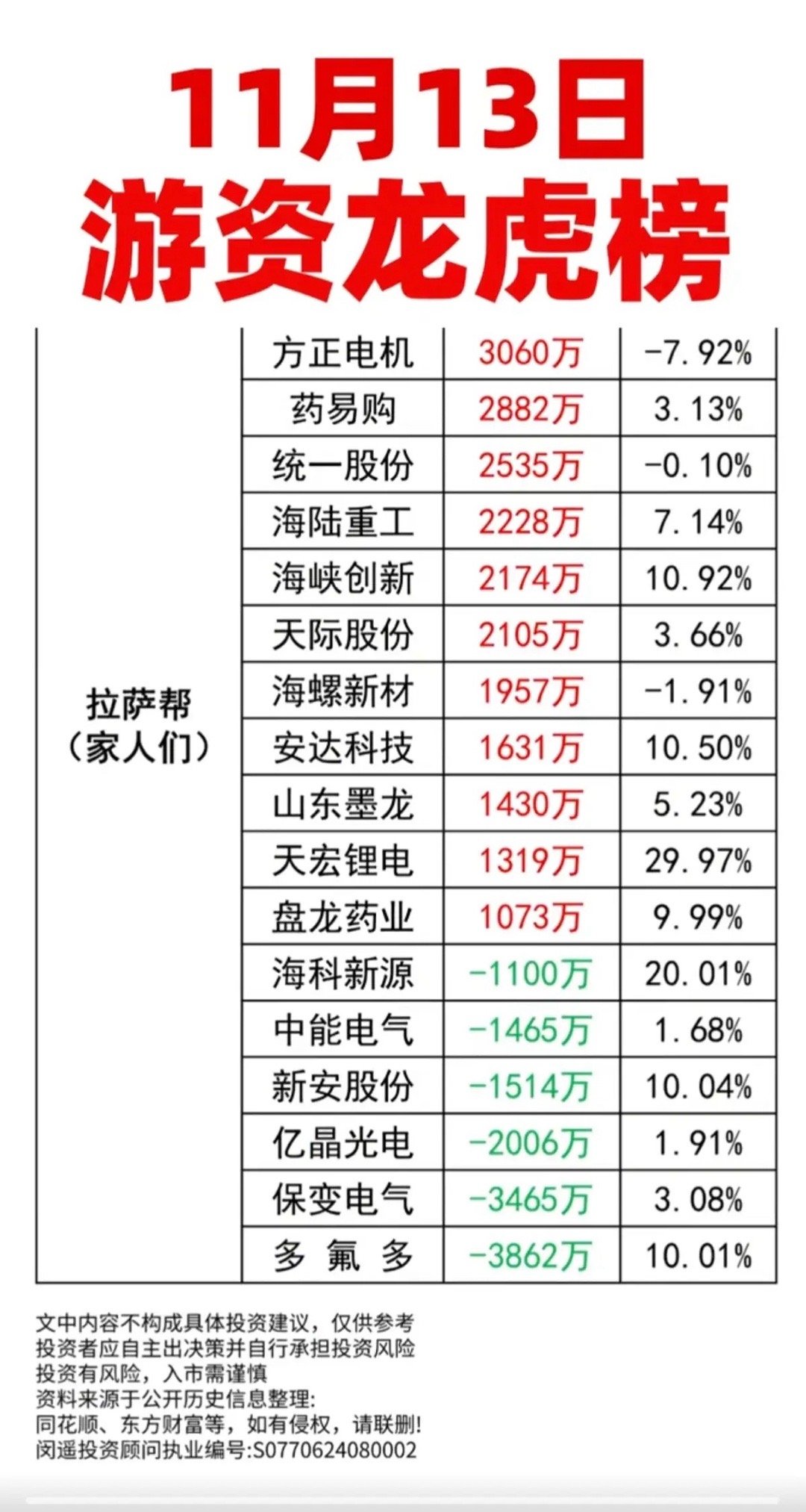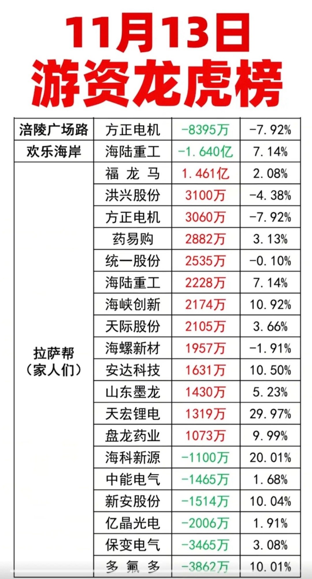 11.13周四 看看游资大佬都买了啥?游资票:一般都是紧跟市场热点方向!第一个集中:医药板块,目前市场总龙头:合富中国,属于医药商业板块,今天游资抢筹医药类股票。第二个:锂电池相关今天电池链简直涨疯了,多达25只股票涨停。跟着游资买,仓位一定不能重,快进快出,把握好卖出买入的节奏很重要。