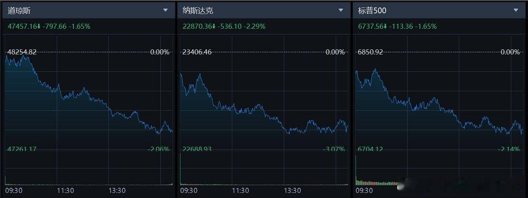 【】美东时间11月13日,美股三大指数集体收跌,道琼斯指数跌797.6点,跌幅1.65%,标普500指数跌1.65%,纳斯达克综合指数跌2.29%;大型科技股收盘多数下跌,特斯拉跌超6%,英特尔跌超5%,AMD、甲骨文跌超4%,英伟达跌超3%,亚马逊、谷歌跌超2%。中概股多数下跌,纳斯达克中国金龙指数跌1.59%;百度跌超6%,哔哩哔哩跌超4%,小鹏汽车、蔚来跌超3%。(每经)