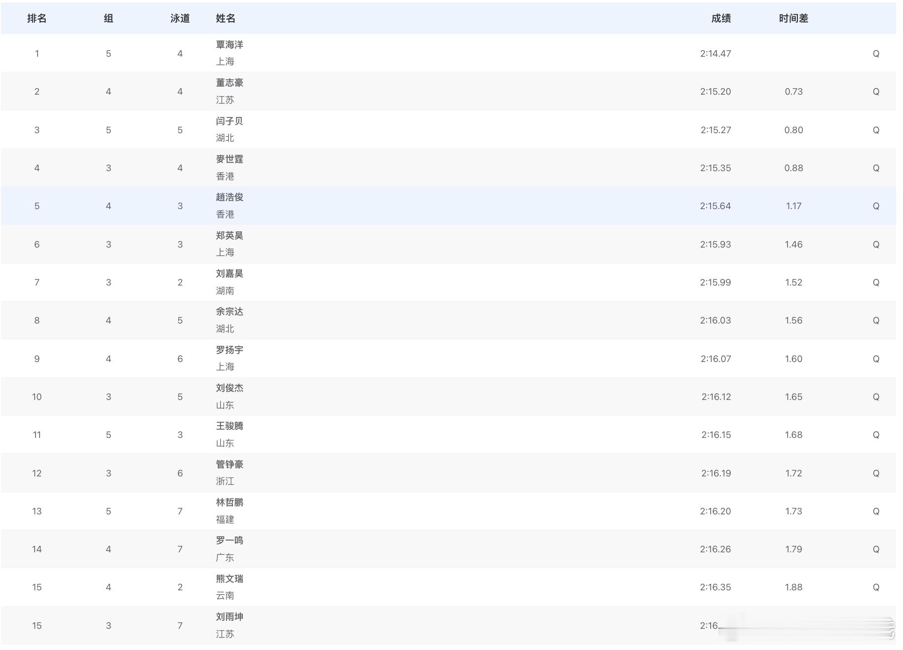 男子200米蛙泳预赛成绩覃海洋 2:14.47董志豪 2:15.20闫子贝 2:15.27麦世霆 2:15.35赵浩俊 2:15.64郑英昊 2:15.93刘嘉昊 2:15.99余宗达 2:16.03罗扬宇 2:16.07刘俊杰 2:16.12 王骏腾 2:16.15管铮豪 2:16.19林哲鹏 2:16.20罗一鸣 2:16.26熊文瑞 2:16.35刘雨坤 2:16.35