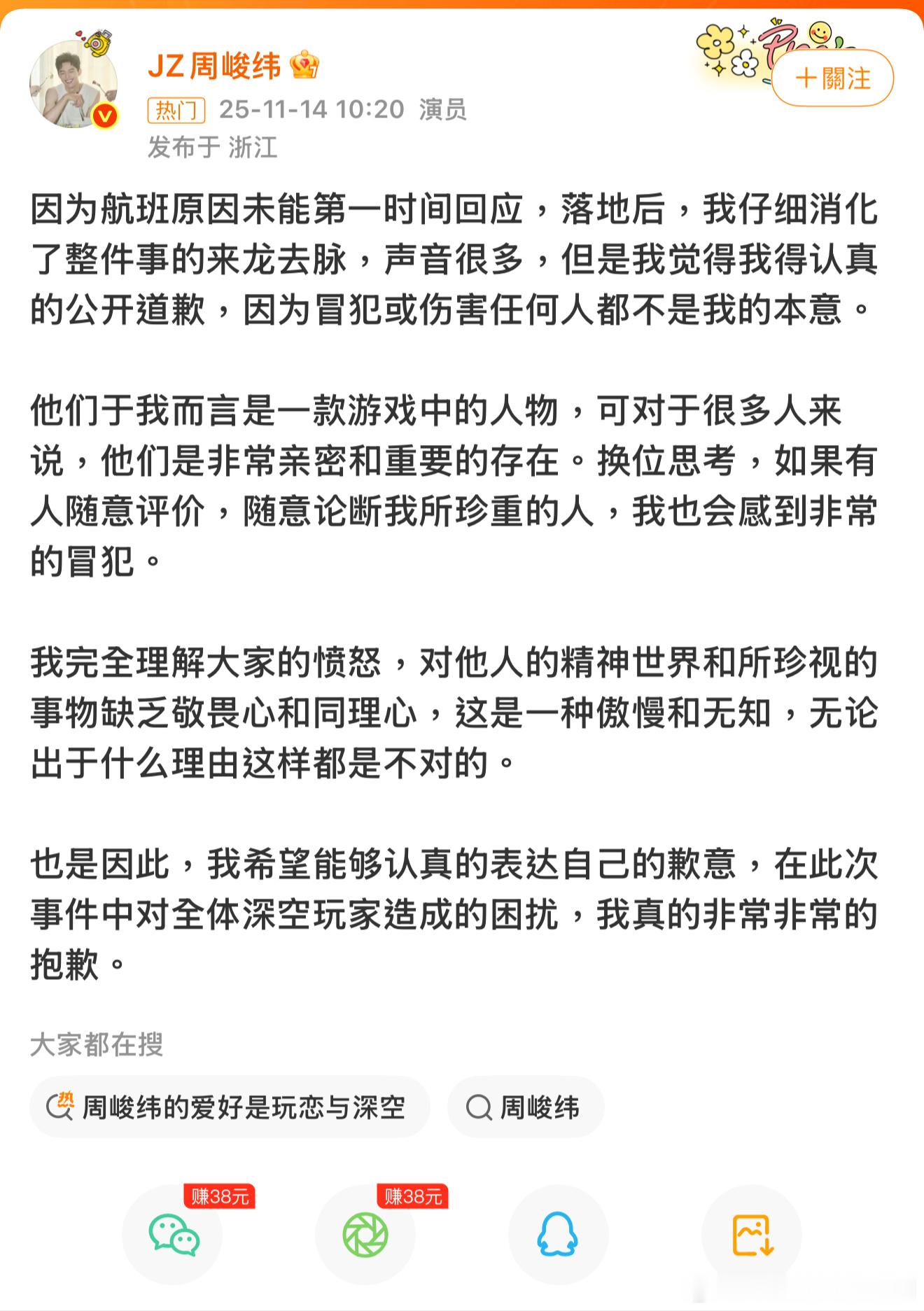 周峻纬这段道歉还挺真诚的,说自己“完全理解大家的愤怒,对他人的精神世界和所珍视的事物缺乏敬畏心和同理心,这是一种傲慢和无知”这是我这几个月以来看到的所有娱乐圈道歉里最真诚的一篇了,208们99%的道歉声明都喜欢给自己找很多借口,处处透露着一种傲慢。当然原不原谅是乙游女自己的自由