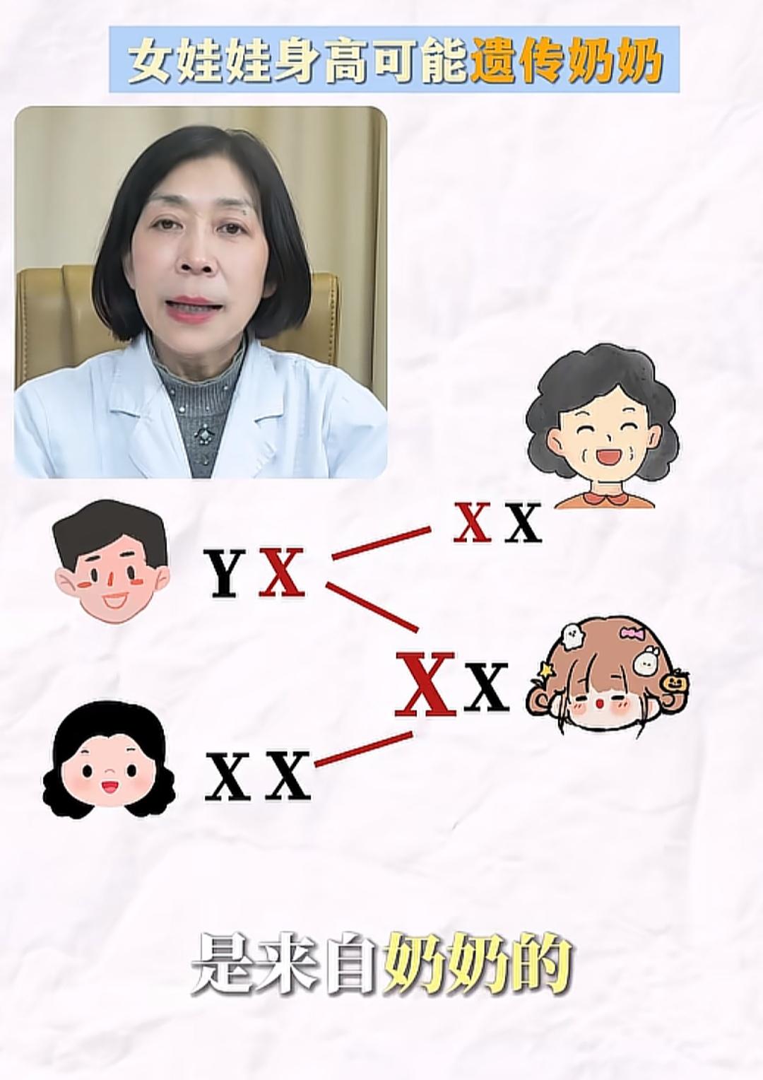 女娃身高矮,跟奶奶有关系。个子矮的婆婆怎么都没想到,孙女矮会跟我有关系。 这个说法成立合理吗? 女孩一条x染色体来自妈妈,一条来自爸爸,爸爸身上的x染色体来自奶奶,这么说,好像也是合理吧。 以后家族想要高个子,确实妈妈要高啊,影响几代人了。