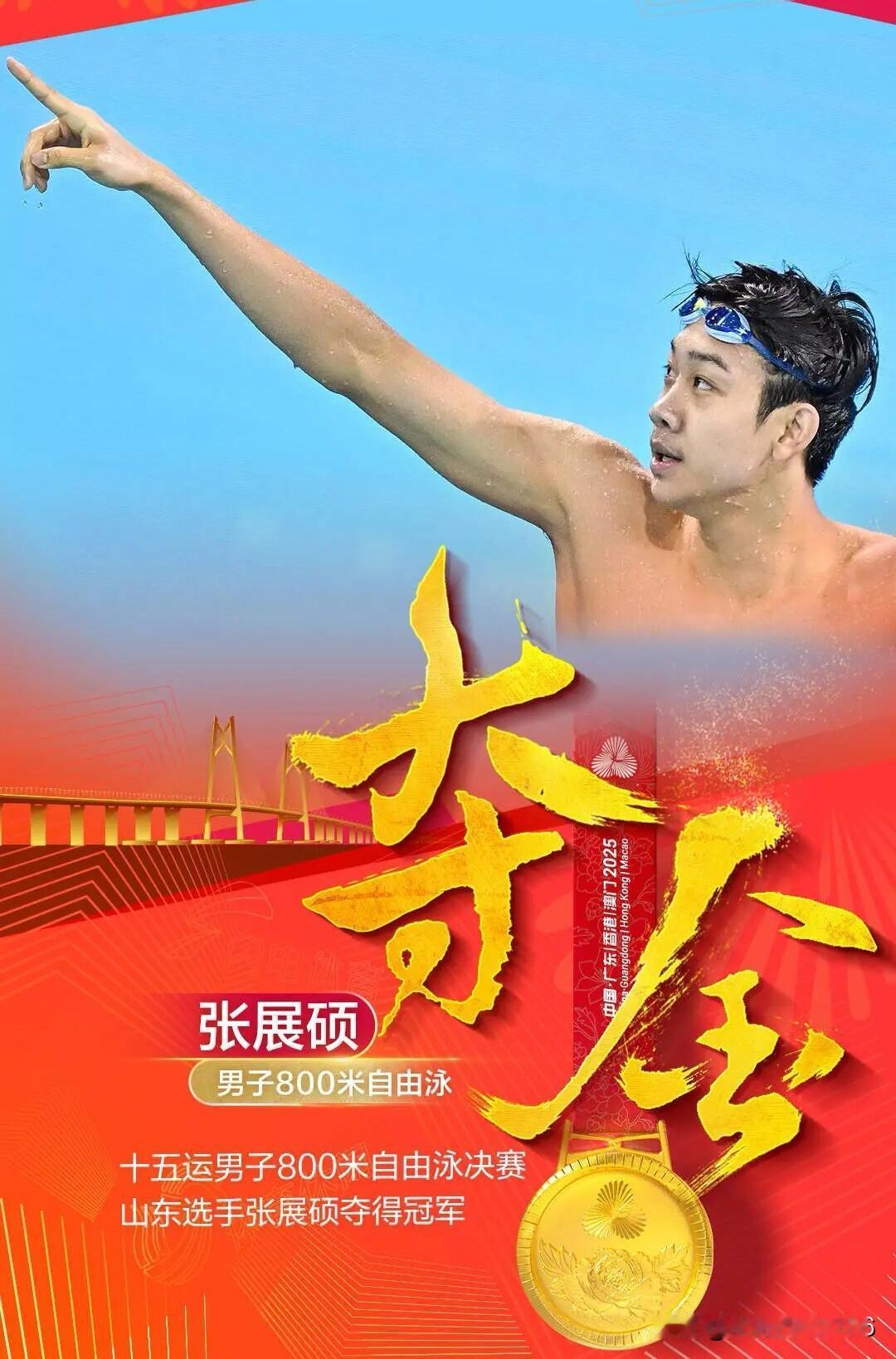 山东新星闪耀泳坛,小将张展硕三破纪录豪取三金。11月13日,全国第十五届运动会游泳赛场再次因山东小将张展硕而沸腾!在男子800米自由泳决赛中,这位年轻的泳坛新锐以无可匹敌的姿态强势夺冠,并一举刷新该项目的全国青年纪录! 这已是张展硕在本届全运会上摘得的第三枚自由泳金牌,其夺金之旅堪称一场破纪录的“个人秀”。就在前一天(12日)的男子200米自由泳赛场,他刚刚改写了全国青年纪录;而在此前(10日)的男子400米自由泳项目中,他更是游出了震撼世界的速度,打破了沉寂已久的世界青年纪录! 短短四天,三度登顶,三破纪录!张展硕以一次次强有力的冲刺,宣告了中国男子中长距离自由泳新一代领军人物的崛起。他的横空出世,不仅为山东代表团增添了沉甸甸的荣誉,更像一针强心剂,为中国游泳注入了蓬勃的青春活力与无限希望。泳池碧波见证了他的拼搏与汗水,也承载着中国游泳走向更广阔未来的梦想。张展硕,未来可期!