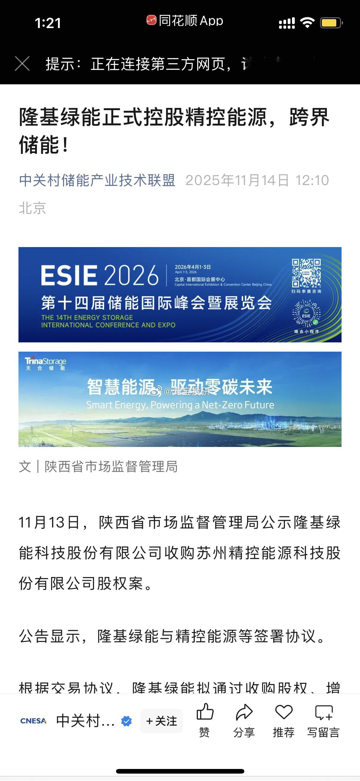 11月13日,陕西省市场监督管理局公示隆基绿能科技股份有限公司收购苏州精控能源科技股份有限公司股权案。公告显示,隆基绿能与精控能源等签署协议。根据交易协议,隆基绿能拟通过收购股权、增资入股、表决权委托的形式取得精控能源约61.9998%的表决权。精控能源主要从事锂离子电池储能系统业务。交易前,自然人合计控制精控能源44.79%股权对应的表决权,单独控制精控能源。交易后,隆基绿能将持有精控能源61.9998%的表决权,并单独控制精控能源。
