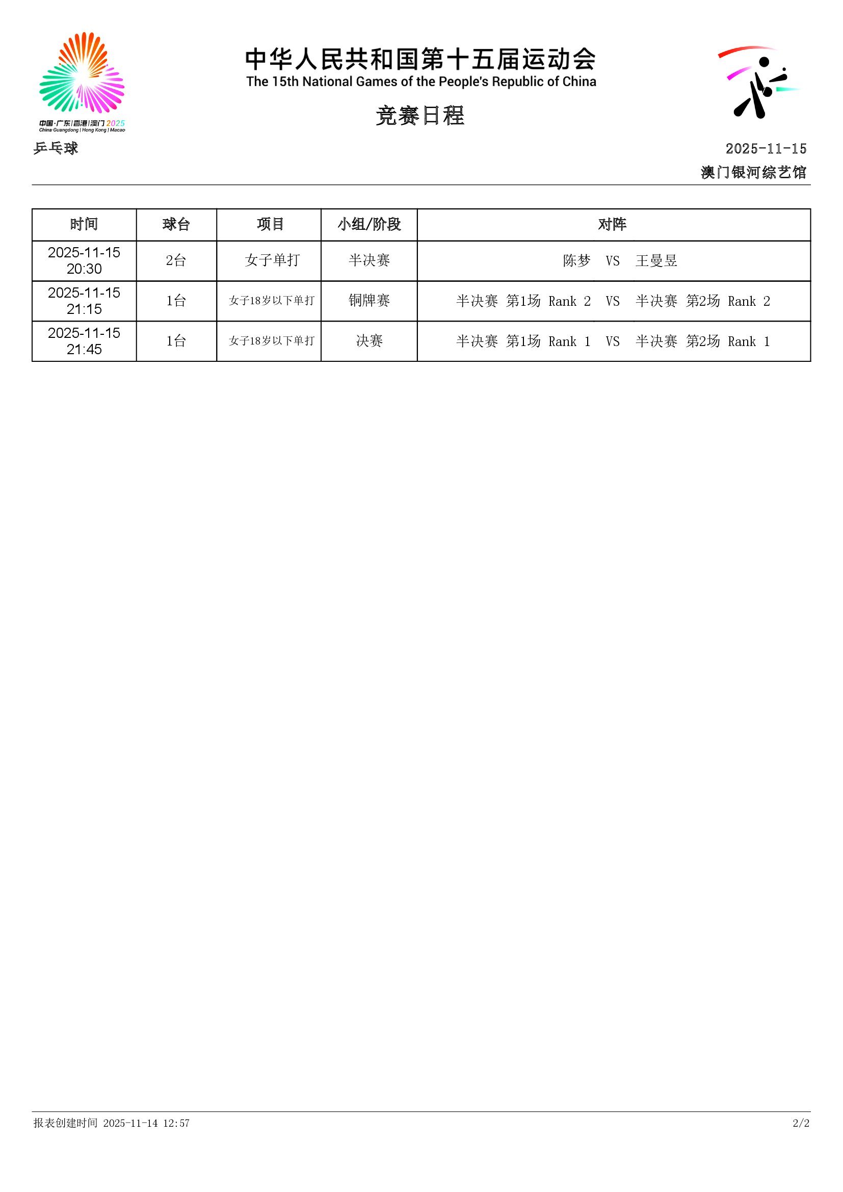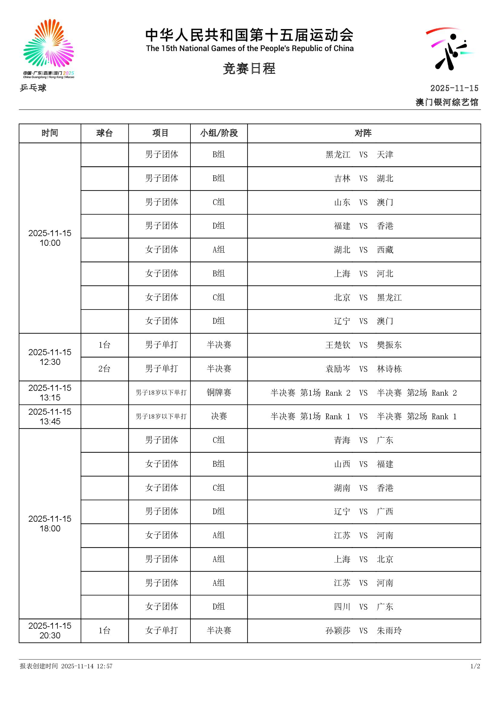 第十五届全国运动会丨11月15日全日赛程官网已出文件版(团体未排桌号),晚上比赛结束后更新完整版