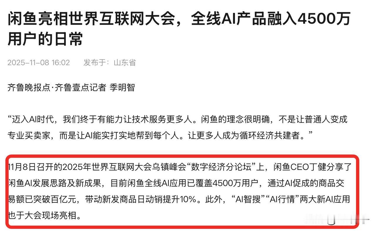 本以为闲鱼就是一个单纯的二手买卖平台,但没想到的是,在AI技术方面也有两把刷子,不简单! 闲鱼上的东西挺多,价格也比较给力,但对于普通人来说,有两个方面比较麻烦: 一个是闲鱼上的行情该怎么确定,另外一个就是该如何找到适合自己的产品。 针对这个问题,闲鱼干了一件事儿——上科技!在最近的世界互联网大会上,闲鱼就展示了两款AI新应用,AI智搜和AI行情。 这两款应用能很好的解决买家不知道怎么买,以及多少钱买的一系列核心问题。 比如用户想在闲鱼上买一个苹果手机,AI应用会先分析买手机的需求,然后再结合你喜欢什么样的产品,再查询一下平台上手机的一个行情,然后给到最符合要求的商品及卖家,整个过程下来最快10秒就能完成。 这个AI应用对于不懂行情,有选择困难症的人来说可谓是相当友好了。 而闲鱼能拿出这么接地气的应用,主要还是它一直在用AI能力,解决用户需求,帮助用户更好的使用闲鱼方面下功夫,比如之前就推出了AI智能托管、AI发布。 放眼现在的互联网江湖,闲鱼的体量不算最大,难能可贵之处就在于,它看到了普通人在交易二手商品时的痛点和巨大需求,充分发挥了AI技术的功用。 闲鱼在技术方面的投入力度极大,用的认可度也非常高,数据不会说谎,目前闲鱼全线AI应用已经覆盖了4500万的用户,通过AI推动成交的商品交易额也超过了百亿元,新发的商品日动销提升了10%。 通过这些,我们不难发现,闲鱼无论是用户规模还是交易规模都都持续快速攀升,这背后也是平台的持续创新,比如将最新的AI技术引入攻克闲置交易固有的痛点,服务好买卖双方,同时还能发现市场的潜在需求,而能做到这些,如果没有两把刷子,那还真不行!