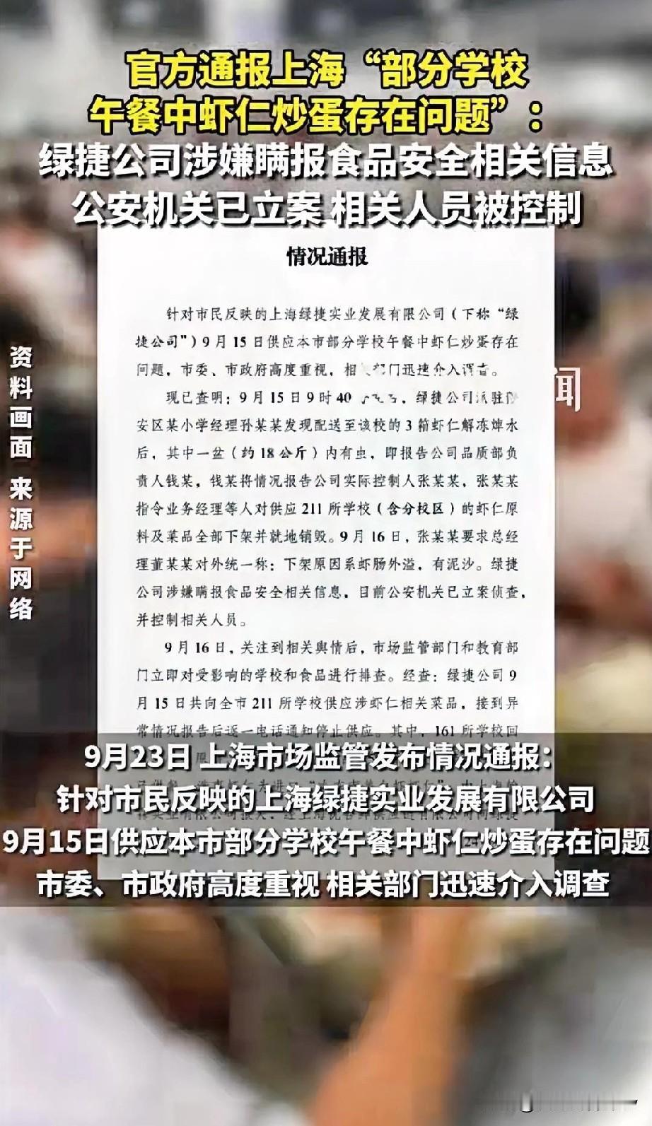 上海校园餐惊现虫体!8人被依法逮捕。 9月15日上午9时40分,静安区某小学厨师王某取出虾仁未清洗便焯水,两条虫体当场浮现,经理孙某亮拍照上报后,公司实际控制人张某华下达指令:“销毁所有虾仁,对外就说虾肠外溢有泥沙”,还要求员工删除记录更换手机,当日211所学校的涉事虾仁全被秘密处理。 昆虫专家鉴定虫体为丽蝇幼体,需在15-35℃环境发育,而虾仁全程冷链运输,源头指向境外生产加工环节。7所学校存在同类不规范烹饪操作,学生因闻到异味挑拣时,饭菜已被紧急撤回,未发生食用情况。 绿捷公司早有违规前科,2所学校曾提前反映同款虾仁发臭,多年来食堂经理多次上报食材质量问题,均被公司压下未报监管部门。该公司还通过围标垄断86个校园餐项目,张某华指使黄某联系招标代理,蒋某等人配合,杨某琴花钱找餐饮公司陪标,统一制作标书并安排自家员工冒充陪标人员参与竞标。 10月28日,张某华等8人因串通投标罪被检察机关批准逮捕,公司多项资质证书已暂停,拟被吊销食品经营许可证和营业执照,相关责任人5年内禁入食品行业。市教委、市监局、闵行区政府分管领导因监管不力被追责。 9月23日起,光明食品集团临时接管484所学校校园餐,推出“明厨亮灶”直播、食材溯源至自有农场的服务,新增14元自选餐模式,部分学校允许学生自主选择就餐方式。此前绿捷公司曾被多次投诉,家长反映餐食中出现未熟西红柿、烂菜叶,甚至有过期食材,其日供餐量曾超50万份,覆盖全市500多所中小学及幼儿园。 相关部门已开展校园餐专项检查,建立第三方满意度匿名调查机制,扩大家长陪餐范围,确保餐食安全可监督。部分家长晒出光盘照,反馈食材新鲜度和口感较之前明显提升。 你家孩子所在学校的餐食由谁供应?有没有遇到过食材或卫生问题?来评论区分享你的经历和看法!