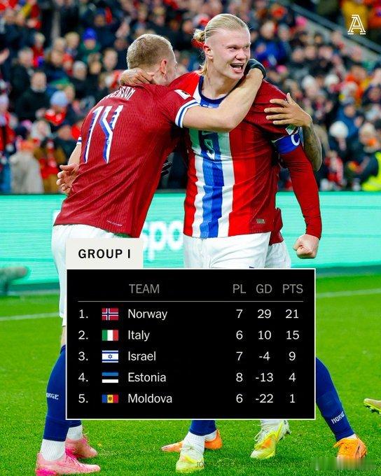 【,挪威无限接近美加墨世界杯!】,挪威7战全胜,打入33球,仅丢4球,净胜球29粒,比少赛一场的意大利多6分,净胜球多19粒,因此即使挪威最后一战对意大利输球,挪威也有很大概率凭借净胜球优势晋级世界杯。