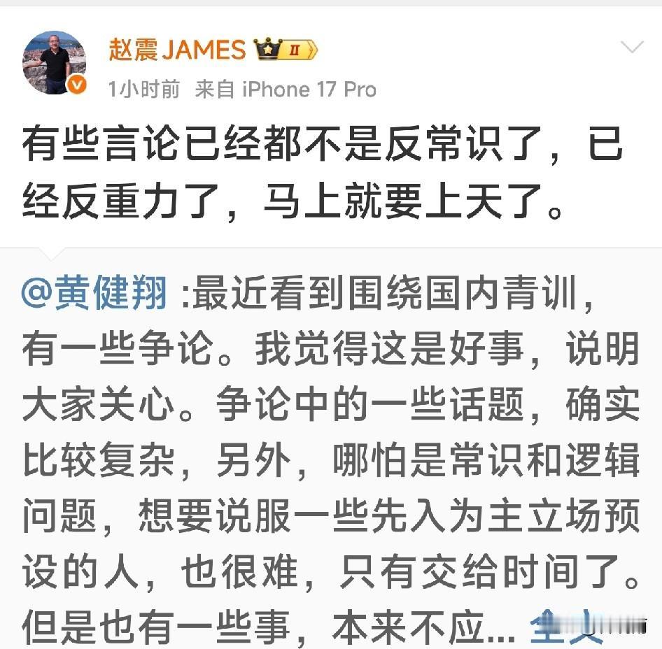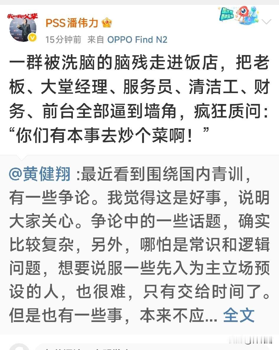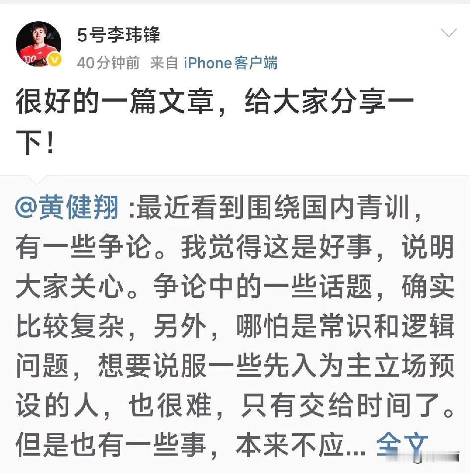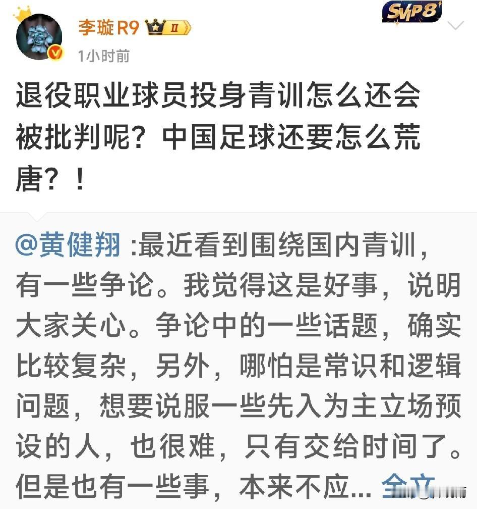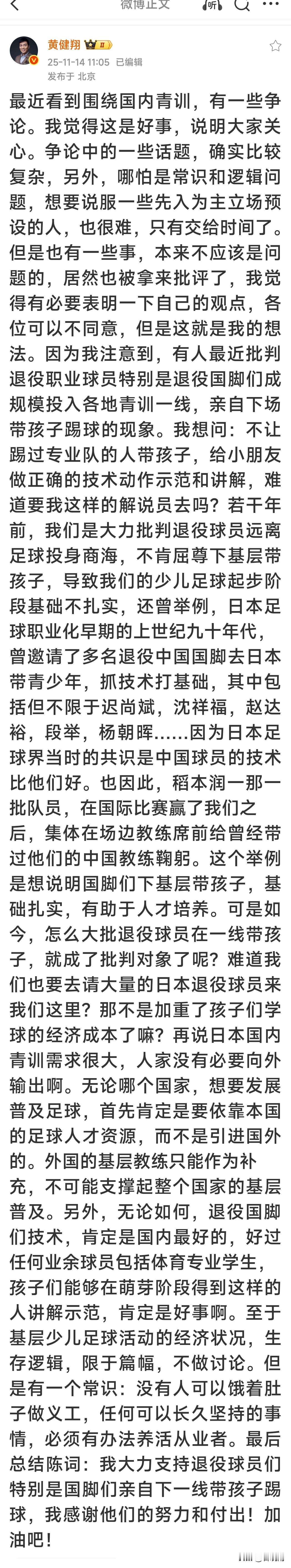 黄健翔社媒称:不让踢过专业队的人带孩子,给小朋友做正确的技术动作示范和讲解,难道要我这样的解说员去吗? 足球媒体人赵震、李璇、徐江、潘伟力以及退役国脚李玮峰纷纷转发评论,目前董路老师还没有任何反应。 著名解说员黄健翔11月14日发表社媒说现在有人竟然批评退役职业球员搞青训,他很不理解,他举例子说日本在足球水平还不行的情况下,请中国的国脚如迟尚斌、沈祥福等人去日本执教,因为当时日本方面认为中国的国际技术别他们好。 他认为退役国脚们技术,肯定是国内最好的,好过任何业余球员包括体育专业学生,孩子们能够在萌芽阶段得到这样的人讲解示范,肯定是好事啊。 最后他表示他大力支持退役球员们特别是国脚们亲自下一线带孩子踢球。 著名前国脚李玮峰转发并评论说这是一篇好文章。 李璇认为退役国脚搞青训还被反对太荒唐了。 赵震认为这样的观点不但反常识还反重力。 目前也有解说员在搞青训,如董路老师,他因为搞足球小将被部分球迷称作当代中国足球青训教父。 他自己也说过如果足球小将的孩子出一个五大联赛的球员他就是中国足球青训教爷。 但也有球迷认为董路的孩子除了0910这个年龄段他带过一段时间,其他年龄段的孩子都是他摇来临时替他打比赛的。虽说组成的队也叫足球小将,但不是他培养的。 特别是有球迷认为董老师不会师范,没有基地,没有固定球队不算青训。 不过支持董路老师的球迷也很多,认为董路老师理念先进,过去中国青训都是退役职业球员搞的 中国足球也不行,不如让董老师这样的非职业球员出身的人干干。 还有中立球迷认为鼓励百花齐放,各类人员都投身青训事业。 您觉得足球青训最应该谁去做?