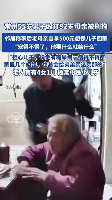 这妈当得,比黄连还苦! 常州55岁的杨某,把92岁的亲妈打了。警察带他走时,老太太扶着门框追,手里攥着皱巴巴的500块,哭着求:“我儿子有糖尿病,瘦得厉害,别关他!” 邻居都说,这儿子是妈宠大的,从小要啥给啥,几个姐姐总给他买东西,连楼下卖馒头的都知道“老杨家小儿子,是妈手心的宝”。 有人说“惯坏了!宠了55年,才敢对妈动手”;也有人说“这妈太可怜,被打了还只想着儿子疼不疼”。 我看着老太太颤巍巍的背影,心里揪得慌,她攥的哪是钱啊,是攒了一辈子的心疼,可儿子挥拳时,咋就忘了小时候妈把他抱在怀里喂饭的日子? 大家见过这样的无条件付出吗?到底是爱,还是害?