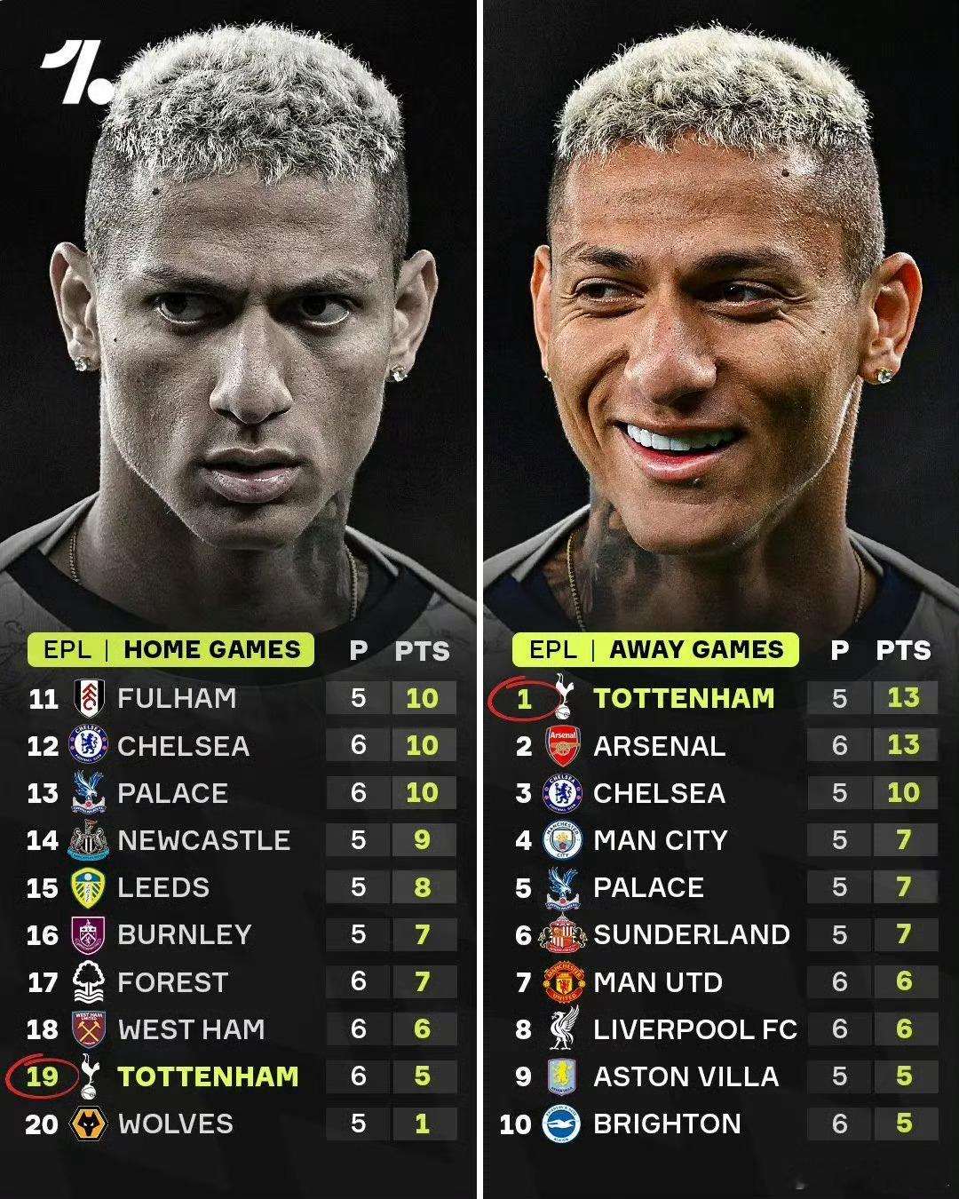 托特纳姆热刺若是只踢客场怕是争冠劲旅…但若只踢主场恐怕要成保级队了本赛季热刺英超客场4胜1平,进9球仅失3球,是英超客场积分最高的球队。热刺客场凭借高效的定位球和反击战术,成为本赛季英超“客场龙”,但伤病潮和主场疲软仍是争四隐患。自托马斯·弗兰克执教以来,球队战绩起伏不定,他仍在调试阵容,但这般极端反差怕是任谁都料想不到若能在未来魔鬼赛程中保持客场稳定性(尤其对阵阿森纳、利物浦),同时改善主场进攻效率,球队有望重返欧冠区。