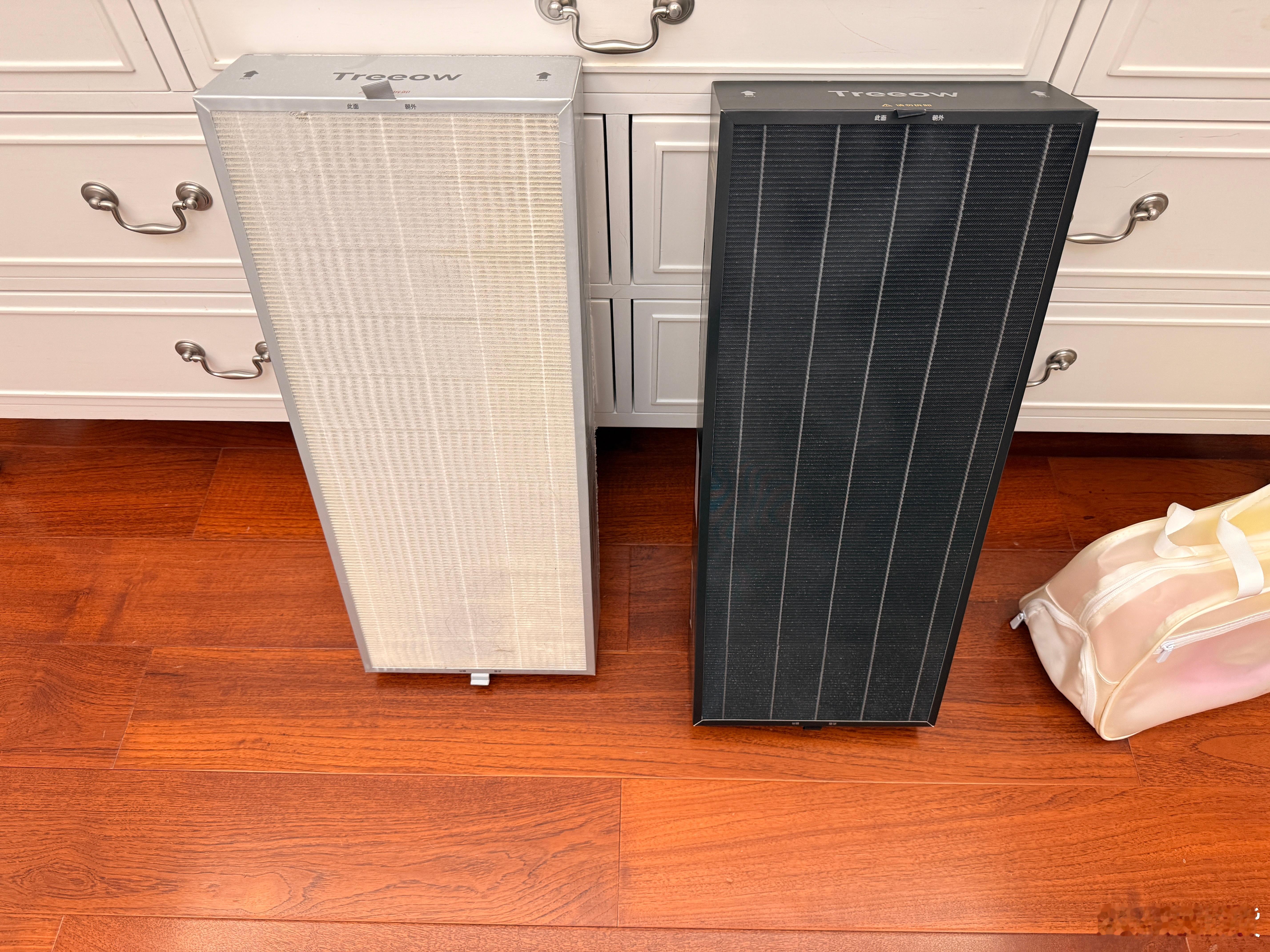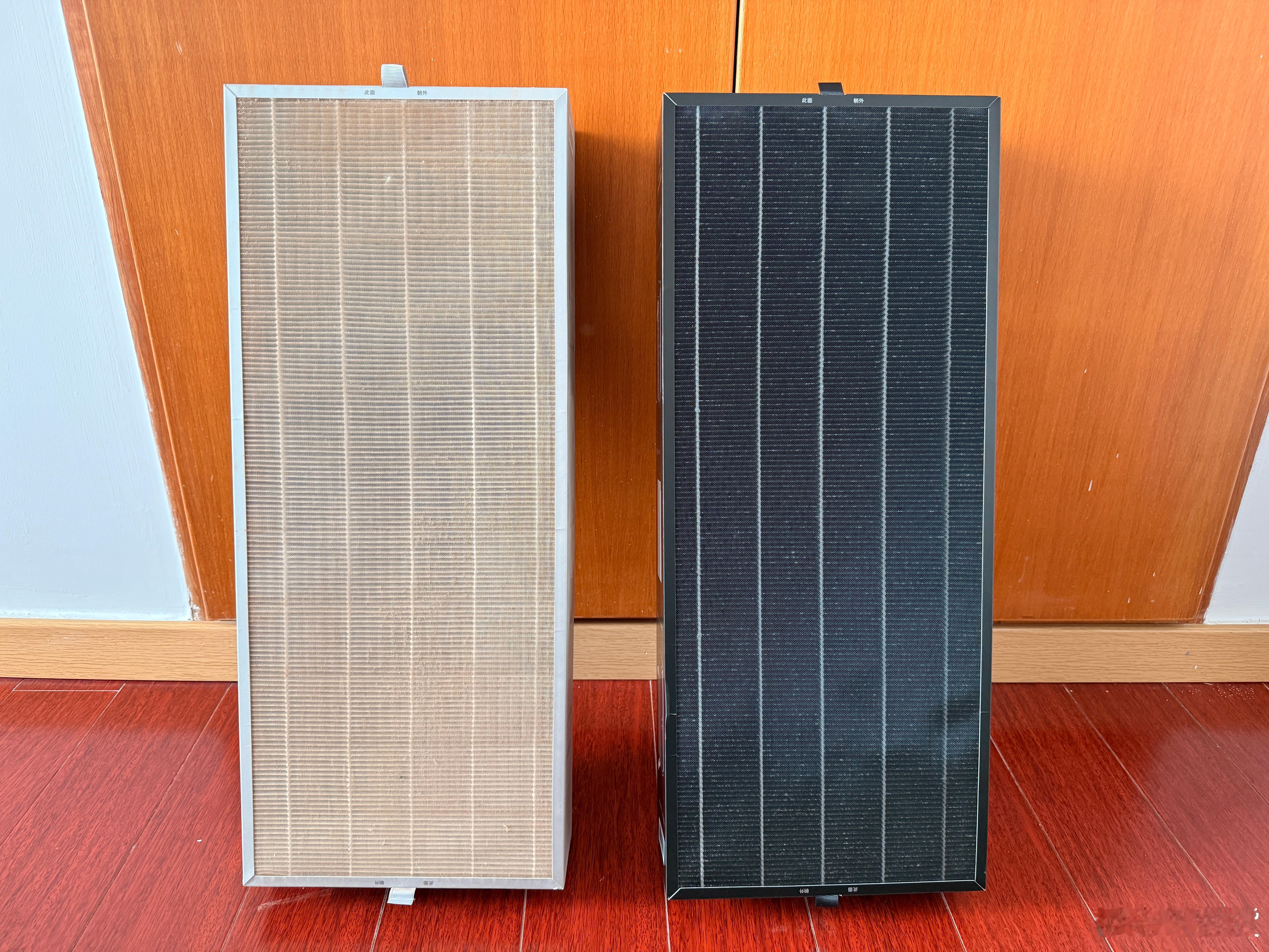 颗粒物少 VS 颗粒物多2年24小时2/3档位 750的CADR滤网对比,树新风NB 图一户外颗粒物高 图二室内有H14新风黑色是新的增加猛系物提高甲醛吸附的黑色的T2Pro 的滤网