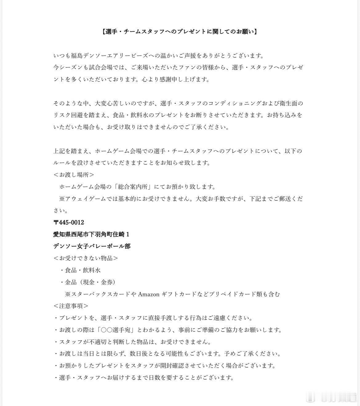 今天日本SV女排联赛球队爱知蜜蜂电装发了一个公告,告诉球迷不要“随便”送礼物【关于送给球员和团队工作人员礼物的请求】感谢您对蜜蜂电装的持续热情支持。本赛季,我们收到了许多前来观赛的粉丝送给球员和工作人员的礼物。我们由衷感激。在这种情况下,我们很遗憾地告知您,考虑到球员和工作人员的体能管理和卫生问题,我们将谢绝食品和饮用水的赠送。请注意,我们无法接受任何带入的食品或饮用水。鉴于上述情况,我们想告知您,在主场赛场关于球员和团队工作人员礼物的以下规则将实施。<领取地点> 我们将在主场赛场的“综合问询处”接受您的物品。*我们一般不接受客场赛场的物品。给您带来不便,非常抱歉。<无法接受的物品> · 食品和饮料 · 金融物品(现金和现金券) ※包括星巴克和亚马逊的礼品卡等预付卡<注意事项> - 请勿直接将礼物交给球员或工作人员。- 交接礼物时,请提前准备好清楚标明“给X球员”的礼物。工作人员认为不适当的物品将不予接受。- 礼物可能不会在当天交接,而是几天后。感谢您的理解。