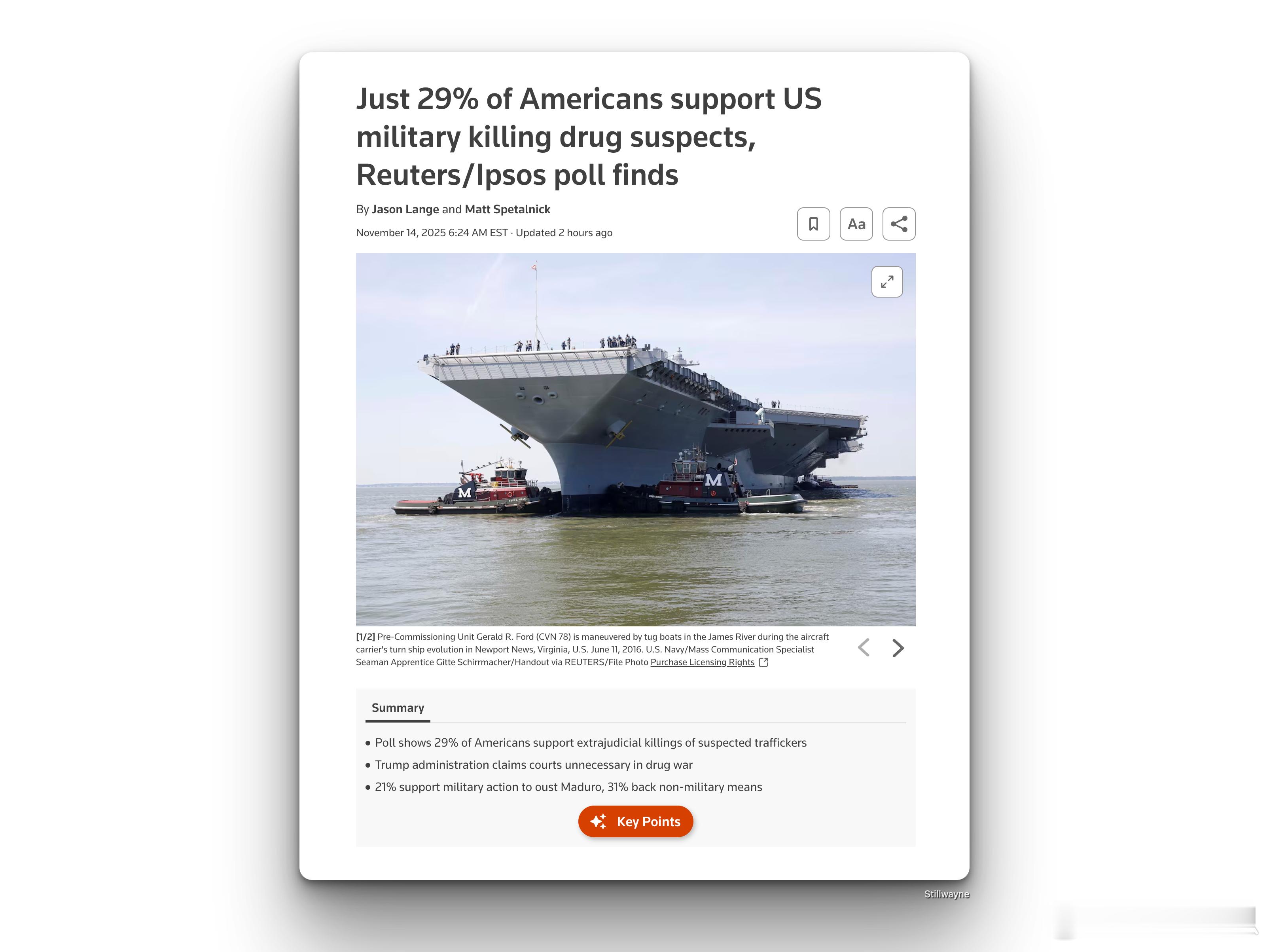 路透/益普索民调,只有29%的美国人支持美军在没有司法介入下杀死“贩毒者”。路透社/益普索民调显示,只有 29% 的美国人支持在没有法官或法院参与的情况下,动用美国军队杀死涉嫌贩毒者,这是对特朗普在加勒比海和东太平洋发动袭击的明确否定。民调显示,共和党内部27%的共和党人反对这种做法,58%的人支持,其余的人则表示不确定。相比之下,四分之三的民主党人反对这种做法,只有十分之一的人支持。