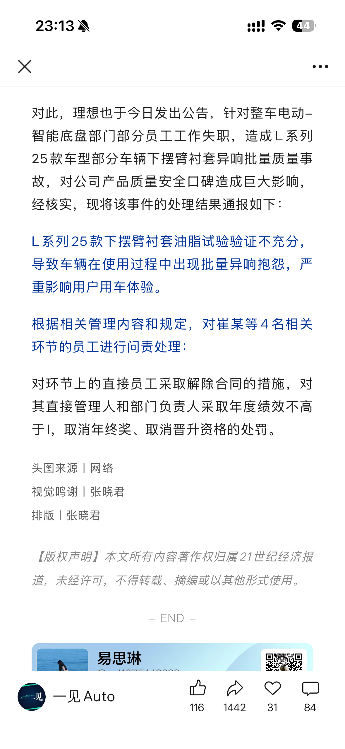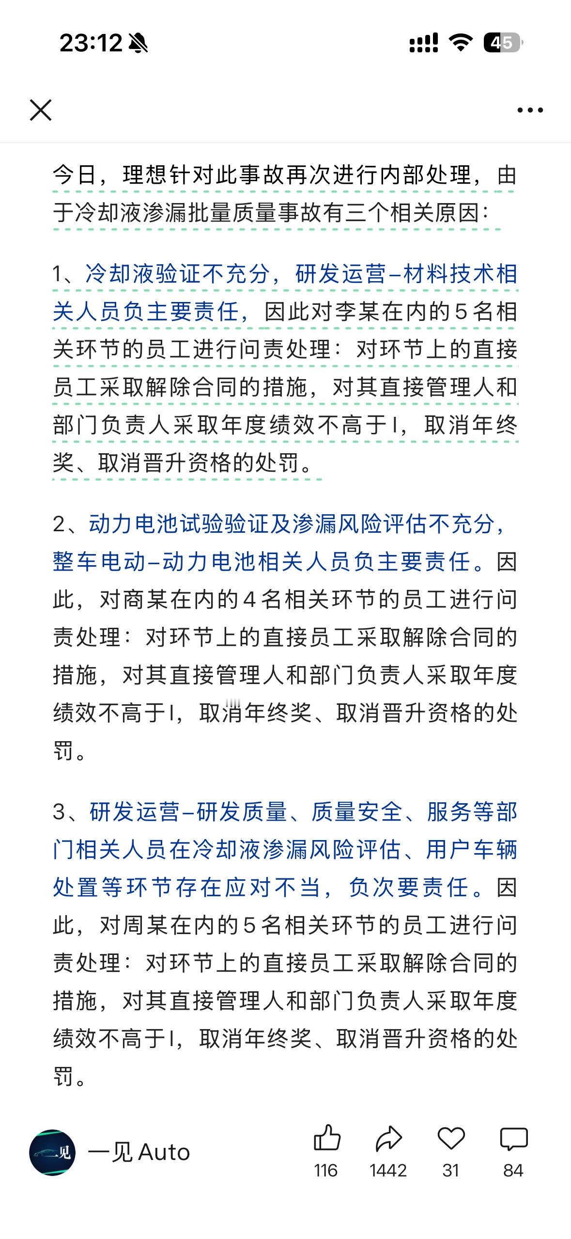 理想MEGA冷却液泄漏,这个责任谁来负?1️⃣冷却液验证不充分,研发运营-材料技术相关人员负主要责任。2️⃣动力电池试验验证及渗漏风险评估不充分,整车电动-动力电池相关人员负主要责任。3️⃣研发运营-研发质量、质量安全、服务等部门相关人员在冷却液渗漏风险评估、用户车辆处置等环节存在应对不当,负次要责任。L系列25款车型部分车辆下摆臂衬套异批量质量事故,这个责任谁来负?根据相关管理内容和规定,对崔某等4名相关环节的员工进行问责处理:对环节上的直接员工采取解除合同的措施,对其直接管理人和部门负责人采取年度绩效不高于1,取消年终奖、取消晋升资格的处罚。这是理想今年两次比较大的事故,当然MEGA的肯定是最严重的。理想今年月确实过得不好,增程没有竞争力,纯电交付太慢。没有一帆风顺的企业,运营中暴露了存在团队管理的问题。虽然人无完人总会犯错,但人命关天,有些错误确实不应该犯。理想自然要承担所有责任,这没什么可说的。经历如此风波每个月还能有3万多用户能下单买车。理想应该感谢用户的支持,感谢应急的信任。这份用户的信任一定要守住,这是任何一个企业安身立命的根本。希望明年的理想能重新出发,不忘初心,坚持住用户价值,守住这份价值的底线就是安全。