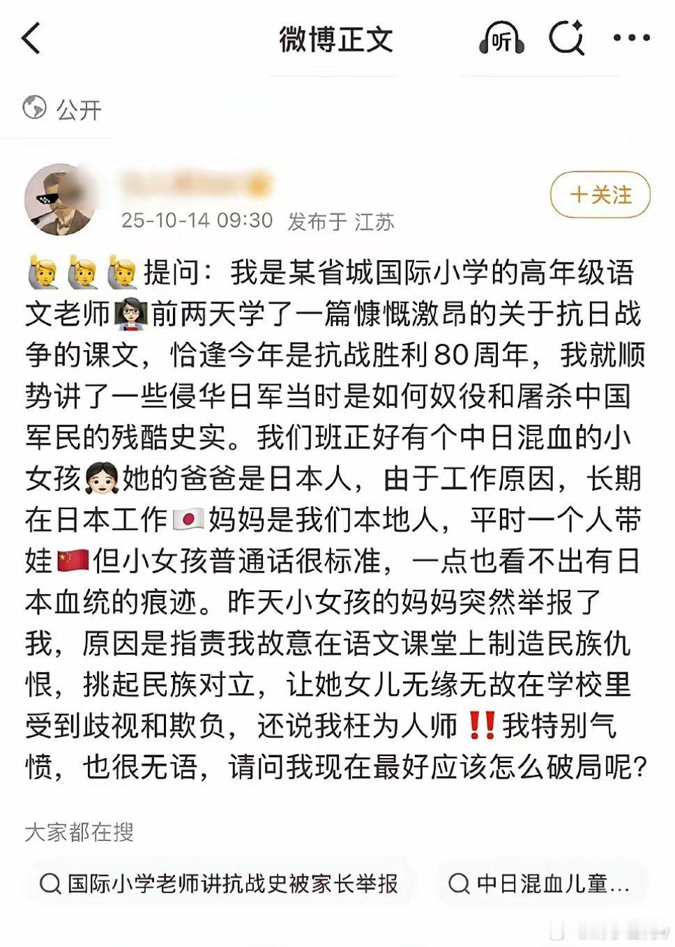 小学课堂上讲侵华日军残暴居然被学生妈妈给举报了,只因为这女家长嫁给了日本人其实这个女家长的想法就是不能在课堂上讲抗日战争,要想尽办法多夸日本,这样她的中日混血女儿才有面子,她也光宗耀祖,女性在政治宗教立场倾向于外国老公有很多