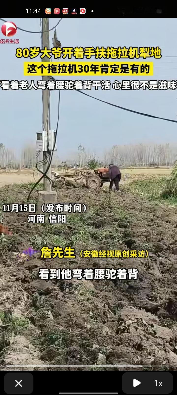 11月12日,信阳市淮滨县。网友晒视频表示,80岁的大爷手扶拖拉机犁地,儿子和孙子在外面打工,大爷闲不住就种了几亩地。这个手扶拖拉机得有30年了,这种款式在河南比较多。看着老人弯着腰驼着背干活,心里不是滋味。