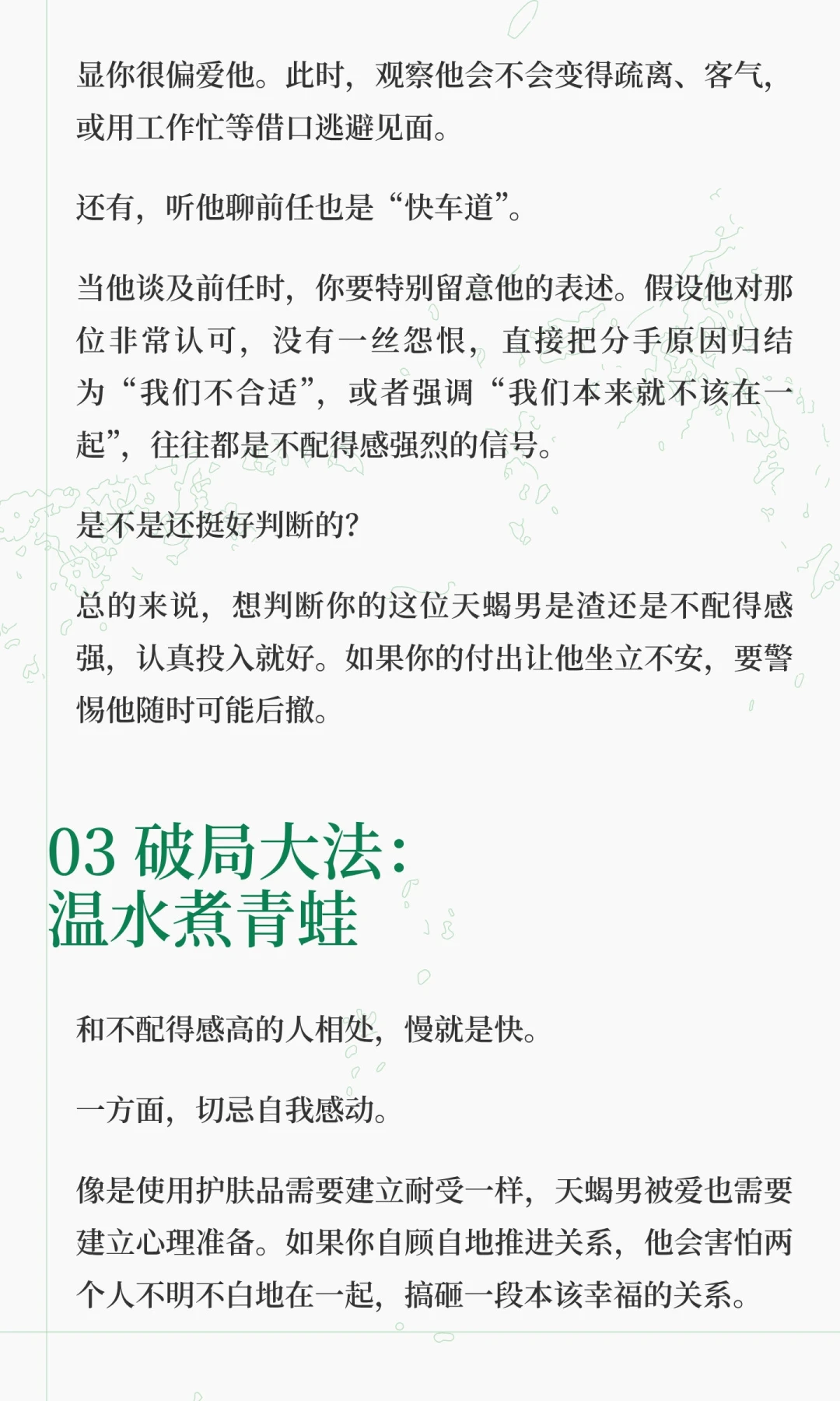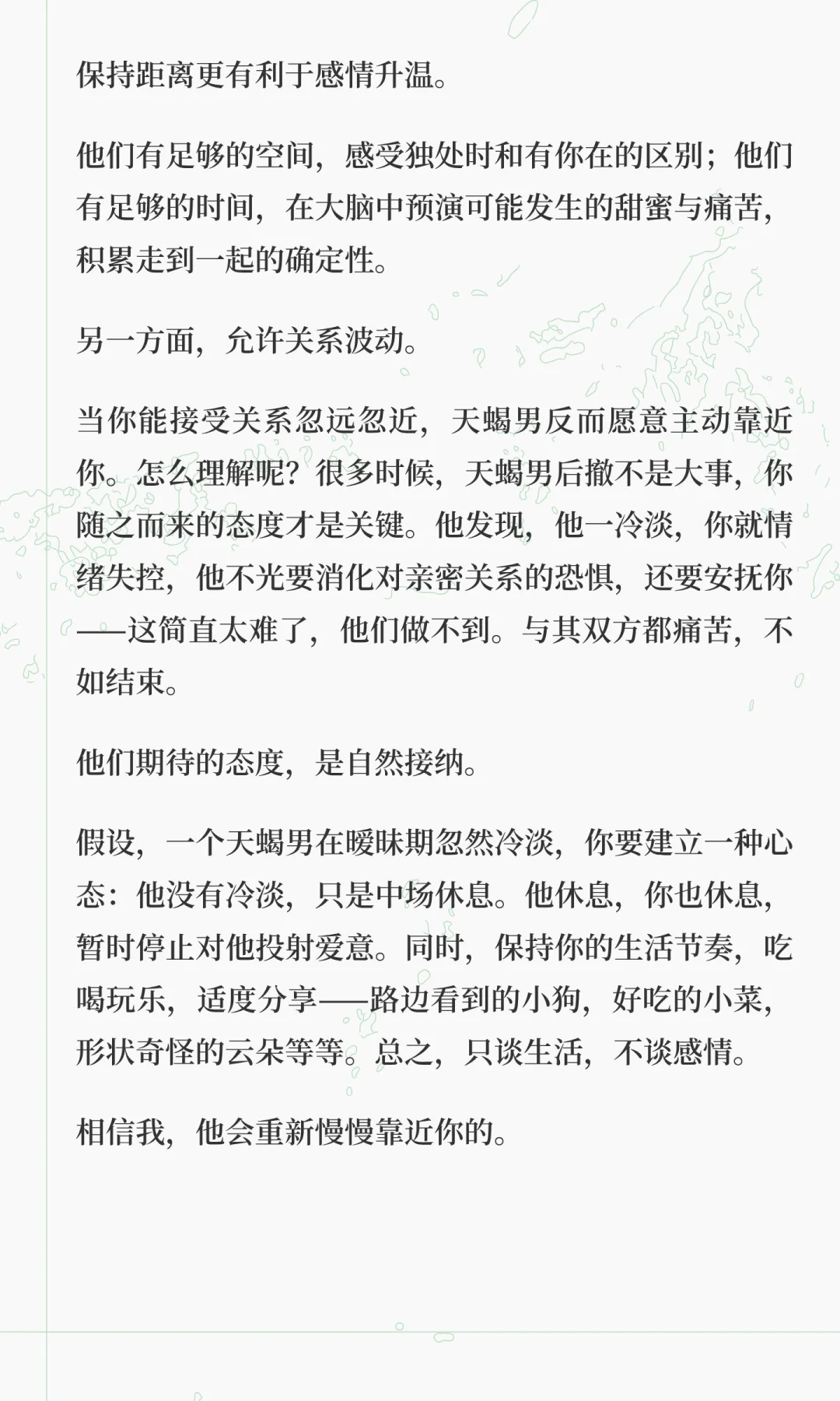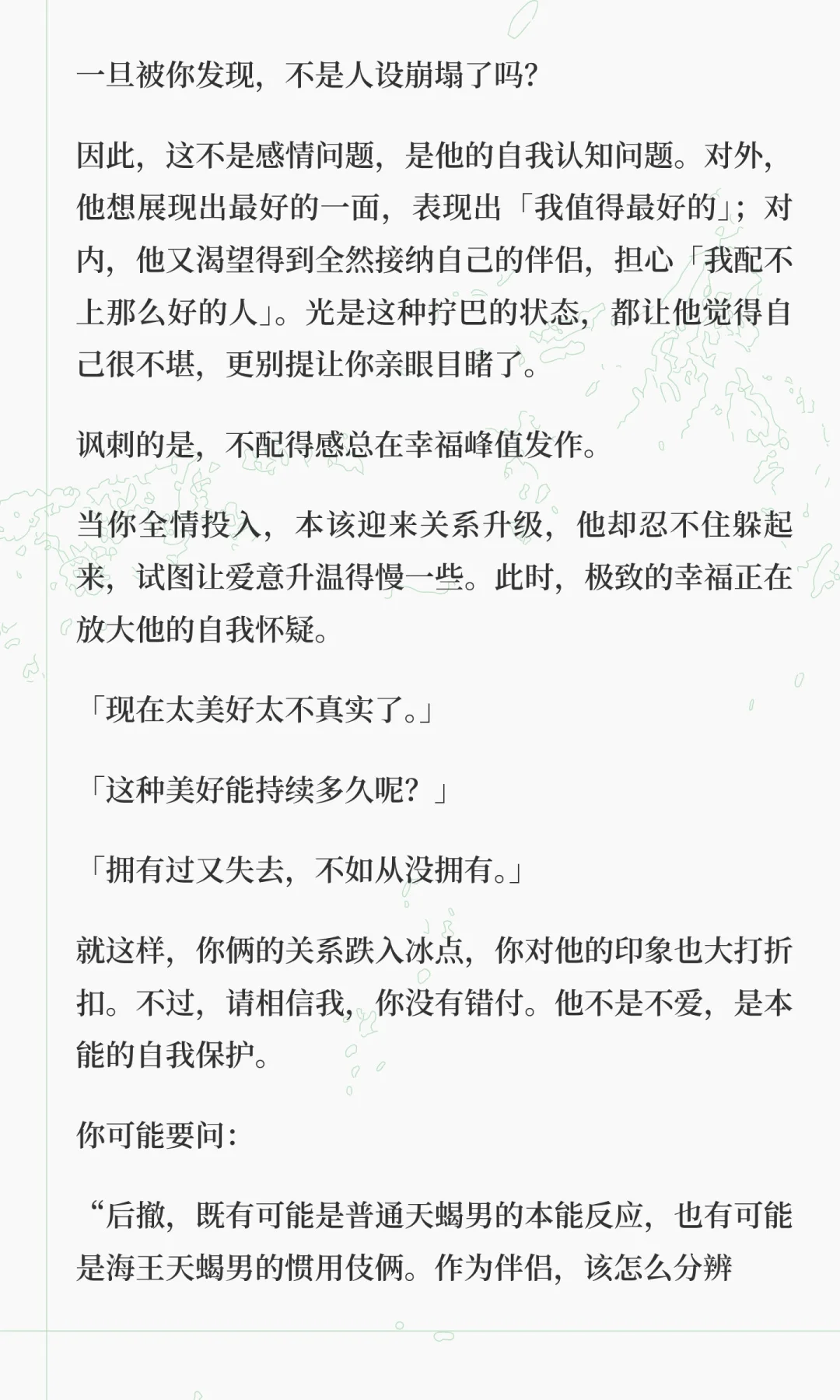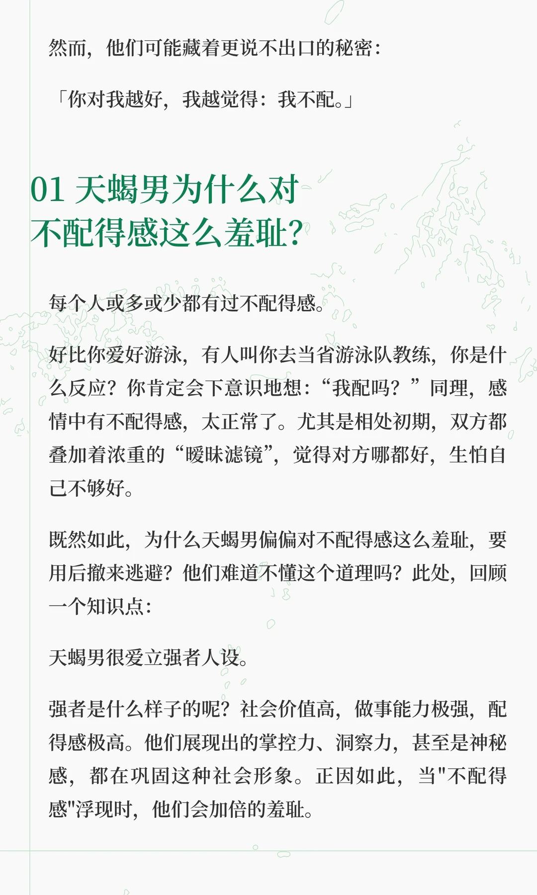 天蝎座真的没有传说中那么薄情。他们的负面名声,大多是暧昧期突然后撤时获得的。更要命的是,他逃跑了,你不能追。除了他有新人,没什么像样的理由能解释。然而,他们可能藏着更说不出口的秘密:「你对我越好,我越觉得:我不配。」